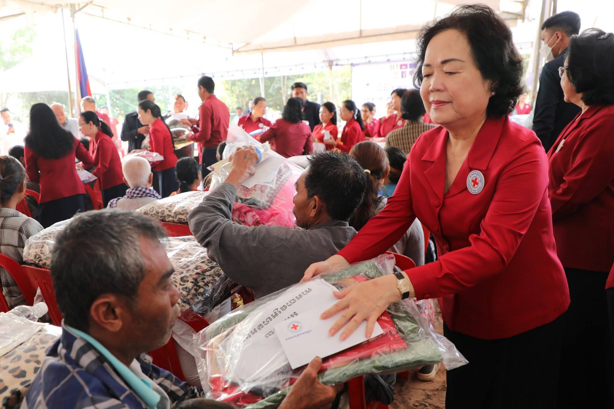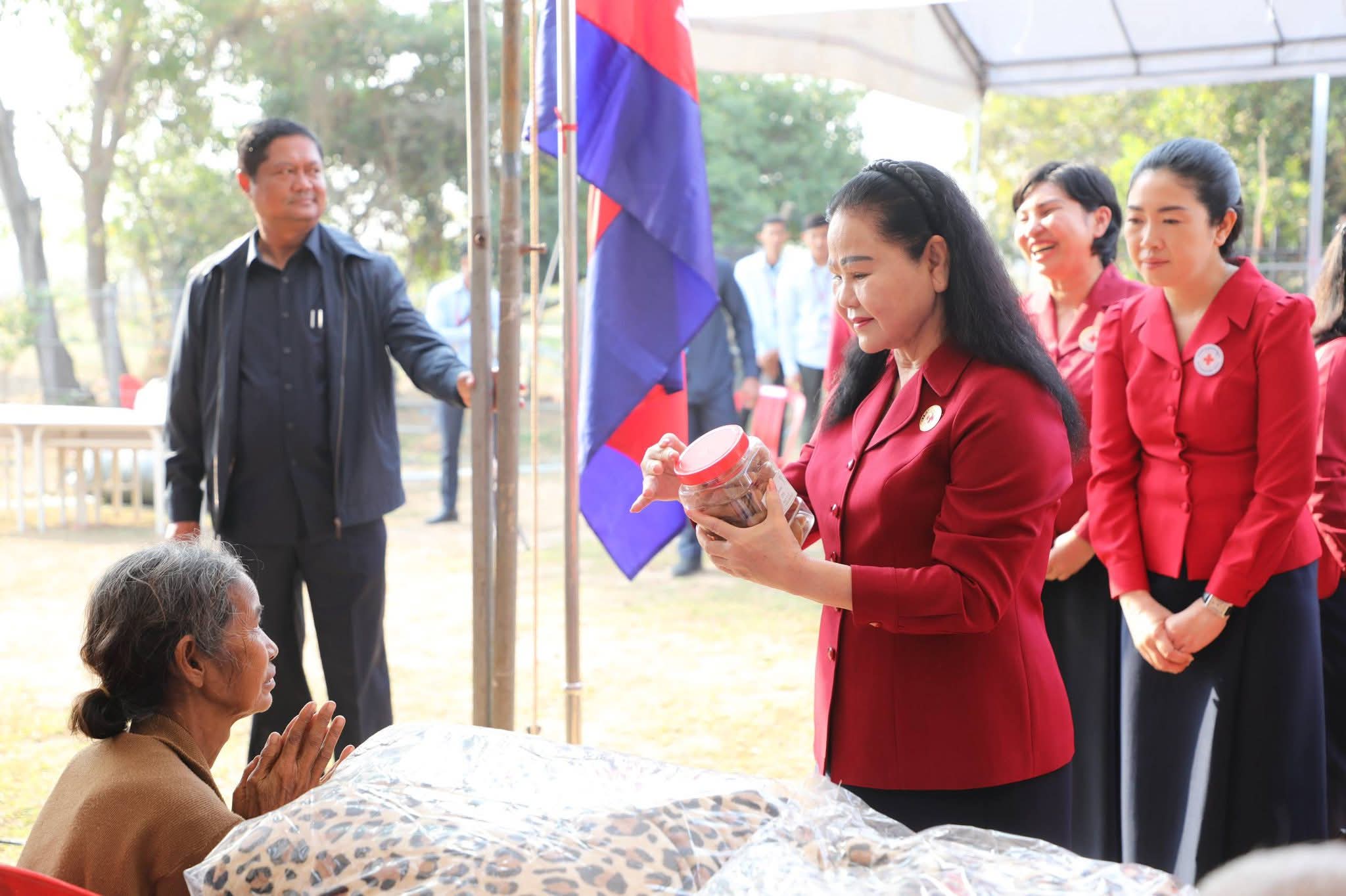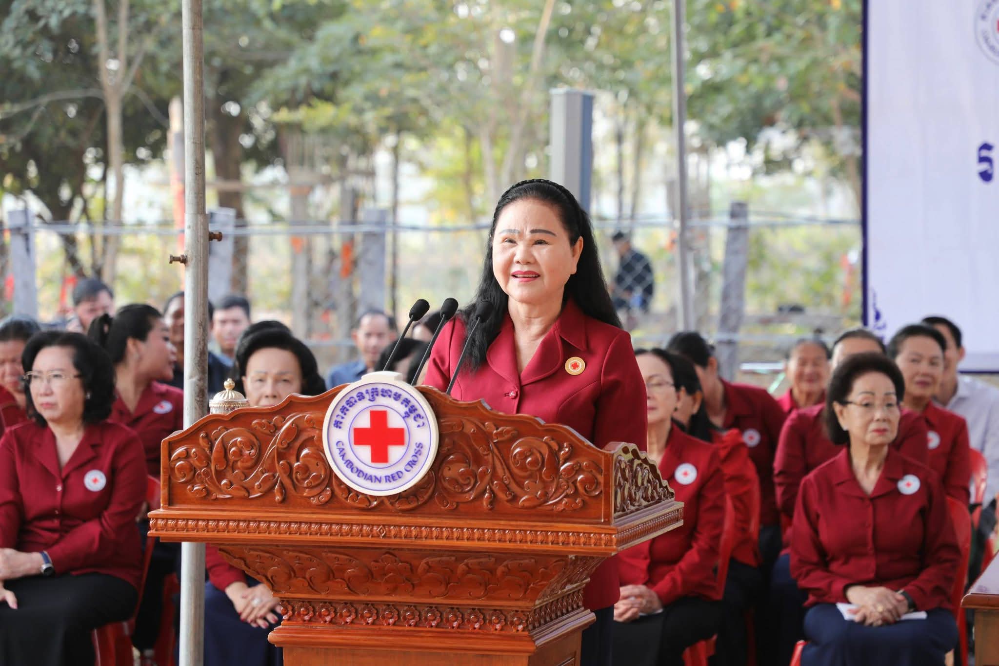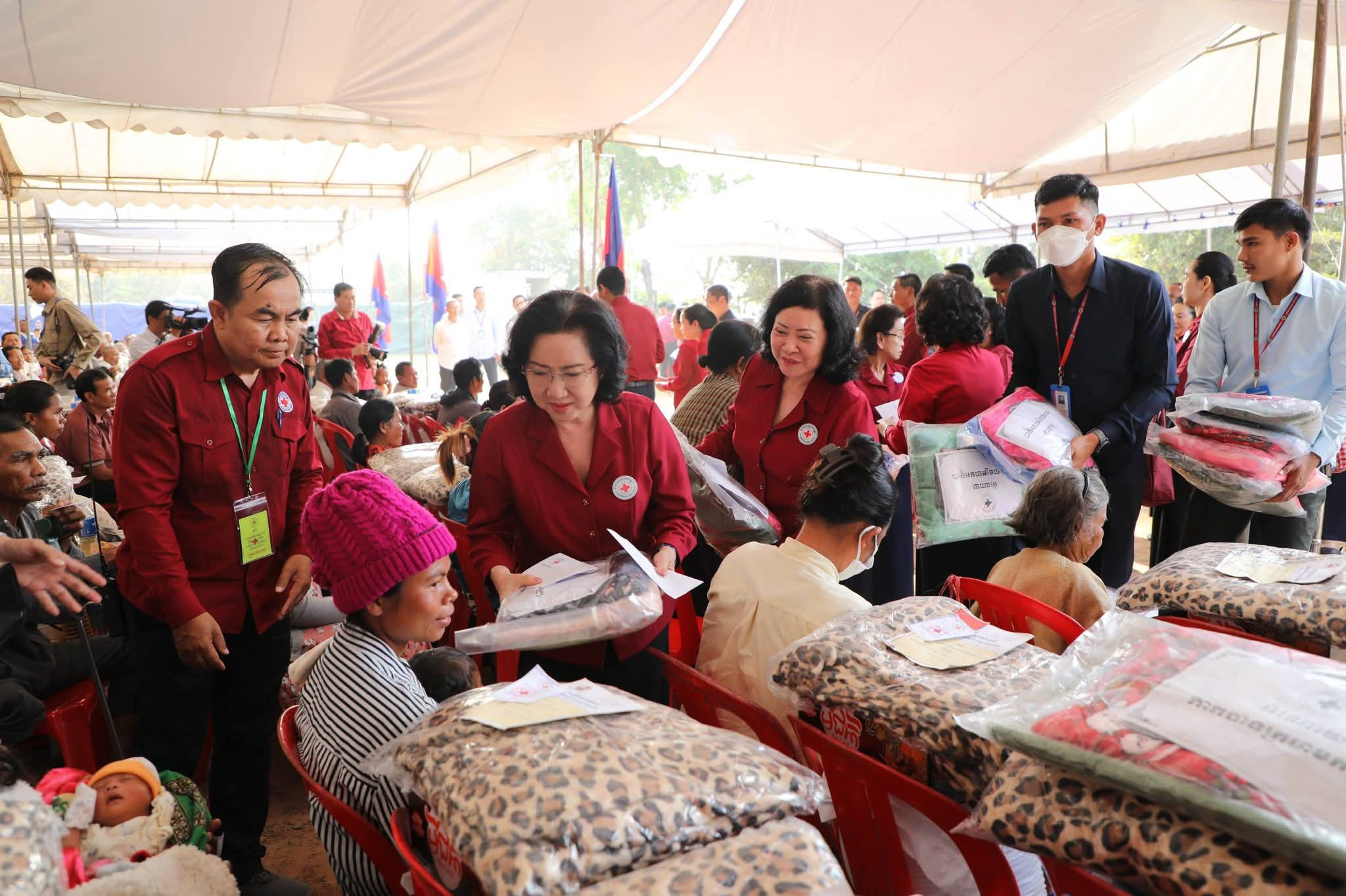 សម្តេចកិត្តិព្រឹទ្ធបណ្ឌិត ប៊ុន រ៉ានី ហ៊ុនសែន បានថ្លែងបញ្ជាក់ថា៖ កាកបាទក្រហមកម្ពុជា ដែលជាជំនួយការឱ្យអាជ្ញាធរសាធារណៈក្នុងវិស័យមនុស្សធម៌ ទោះបីជាស្ថិតក្នុងកាលៈទេសៈណាក៏ដោយក៏កាកបាទក្រហមកម្ពុជា នៅតែគិតគូរយកចិត្តទុកដាក់ដល់ប្រជាពលរដ្ឋគ្រប់ពេលវេលា ហើយស្បៀង-សម្ភារដែលនាំមកចែកជូនជួយសម្រាលការលំបាកដល់បងប្អូនប្រជាពលរដ្ឋនាពេលនេះ គឺទទួលបានពីសប្បុរសជនគ្រប់មជ្ឈដ្ឋាន ដែលមានសទ្ធាជ្រះថ្លាឧបត្ថម្ភជាស្បៀង សម្ភារ និងថវិកាជូនដល់កាកបាទក្រហមកម្ពុជា ទើបកាកបាទក្រហមកម្ពុជានាំយកអំណោយទាំងអស់នេះមកជួយសម្រាលការលំបាកដល់បងប្អូនប្រជាពលរដ្ឋនាពេលនេះ។ ជាក់ស្តែង អំណោយដែលនាំយកមកចែកជូននាពេលនេះមាន ភួយ ជាអំណោយរបស់ គណៈកម្មាធិការអន្តរជាតិនៃកាកបាទក្រហម (ICRC), មុងអង្រុត និងភួយ ជាអំណោយរបស់ក្រុមហ៊ុន តូយ៉ូតា ខេមបូឌា, ភេសជ្ជៈបាកាស ជាអំណោយរបស់ អ្នកឧកញ៉ា សុខ សំណាង និងលោកជំទាវ ស៊ីម សុនិមល, នំប៉័ងនិងទឹកសុទ្ធ ជាអំណោយរបស់សាខាកាកបាទក្រហមកម្ពុជា ខេត្តសៀមរាប។ ដោយឡែក លោកជំទាវ អ៊ូ ធីតាពៅ គួចចំរើន បានឧបត្ថម្ភថវិកា ១ម៉ឺនដុល្លារ និងលោកអ្នកឧកញ៉ា ហុង សួន ស៊ីគង់ទ្រីវ ក៏បានឧបត្ថម្ភថវិកា ១ម៉ឺនដុល្លារ ជូនដល់កាកបាទក្រហមកម្ពុជា ដើម្បីសកម្មភាពមនុស្សធម៌ផងដែរ។