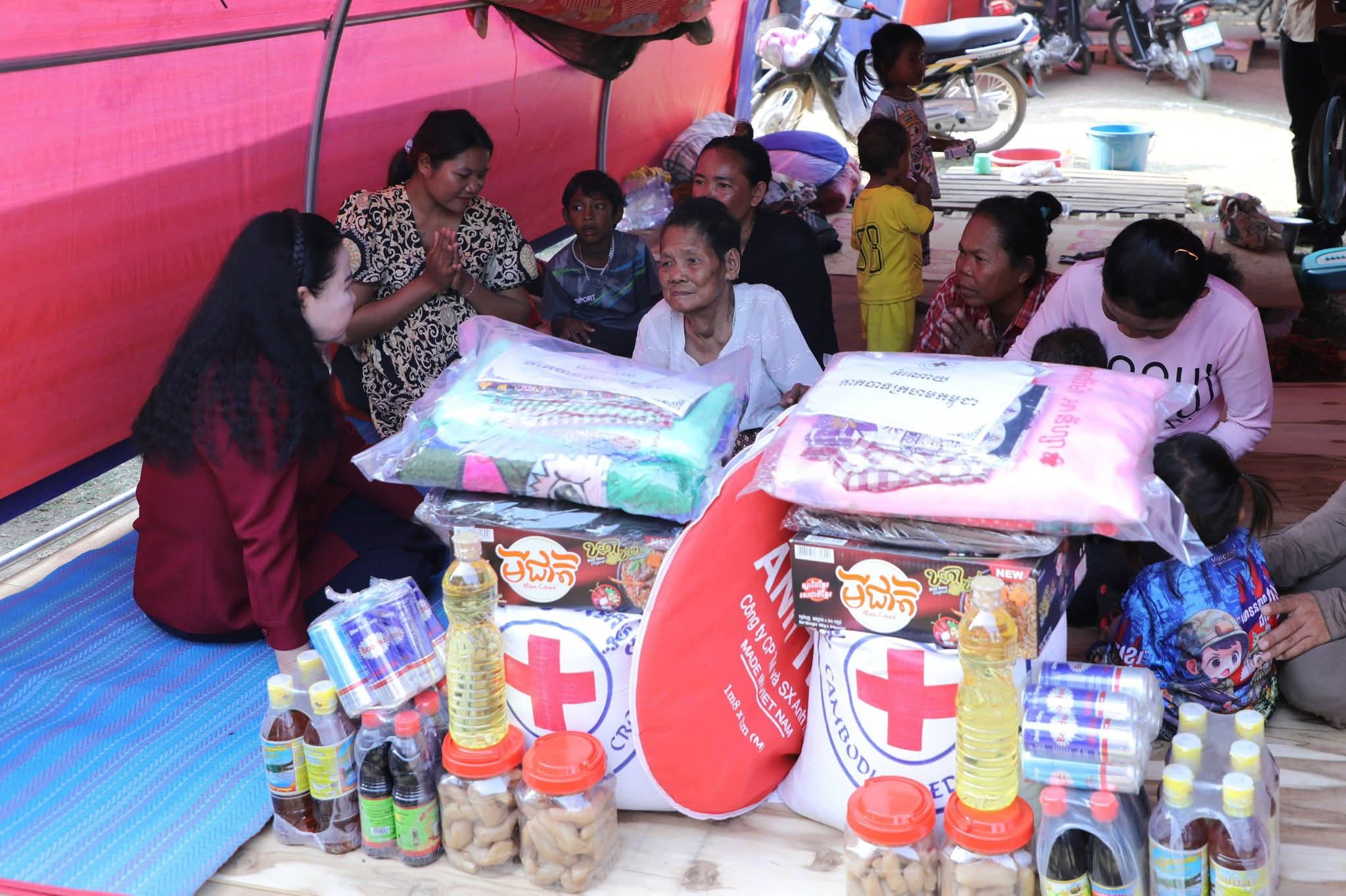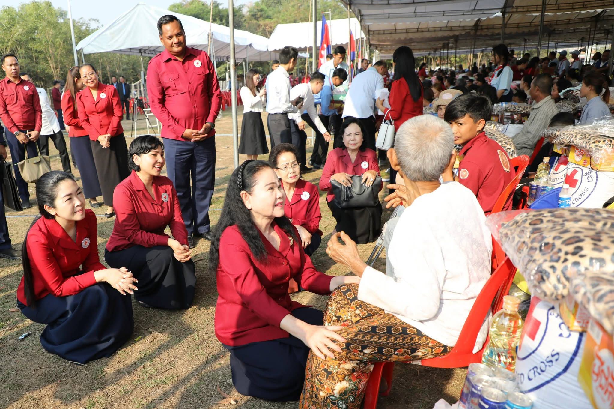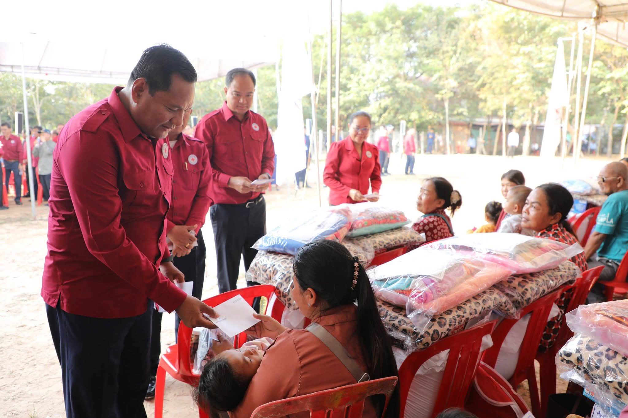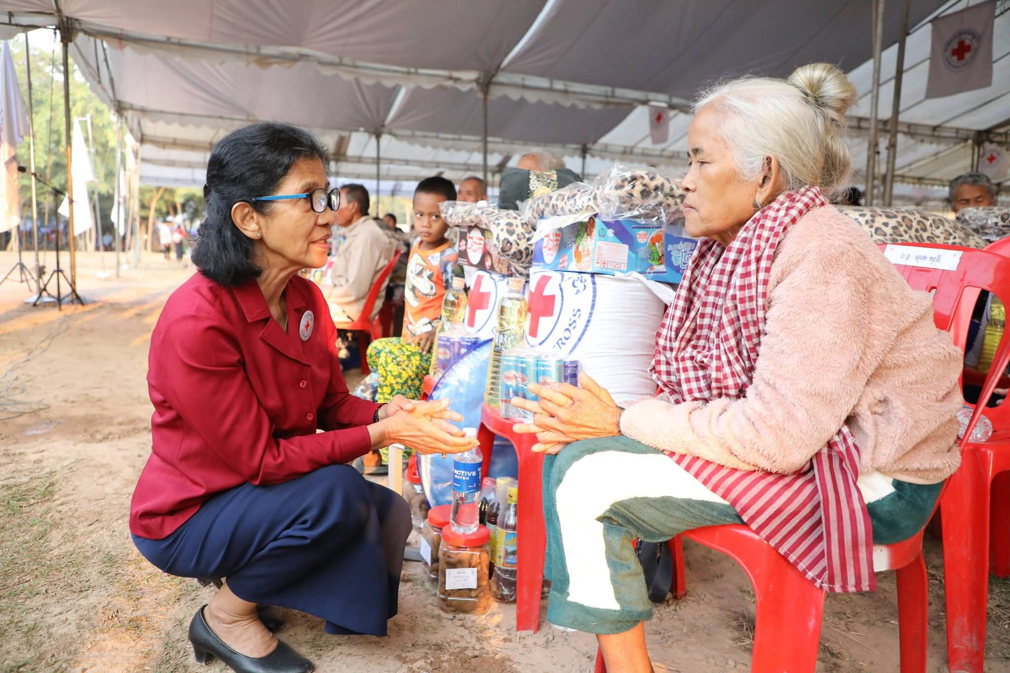 សម្តេចកិត្តិព្រឹទ្ធបណ្ឌិត ប៊ុន រ៉ានី ហ៊ុនសែន បានថ្លែងបញ្ជាក់ថា៖ កាកបាទក្រហមកម្ពុជា ដែលជាជំនួយការឱ្យអាជ្ញាធរសាធារណៈក្នុងវិស័យមនុស្សធម៌ ទោះបីជាស្ថិតក្នុងកាលៈទេសៈណាក៏ដោយក៏កាកបាទក្រហមកម្ពុជា នៅតែគិតគូរយកចិត្តទុកដាក់ដល់ប្រជាពលរដ្ឋគ្រប់ពេលវេលា ហើយស្បៀង-សម្ភារដែលនាំមកចែកជូនជួយសម្រាលការលំបាកដល់បងប្អូនប្រជាពលរដ្ឋនាពេលនេះ គឺទទួលបានពីសប្បុរសជនគ្រប់មជ្ឈដ្ឋាន ដែលមានសទ្ធាជ្រះថ្លាឧបត្ថម្ភជាស្បៀង សម្ភារ និងថវិកាជូនដល់កាកបាទក្រហមកម្ពុជា ទើបកាកបាទក្រហមកម្ពុជានាំយកអំណោយទាំងអស់នេះមកជួយសម្រាលការលំបាកដល់បងប្អូនប្រជាពលរដ្ឋនាពេលនេះ។ ជាក់ស្តែង អំណោយដែលនាំយកមកចែកជូននាពេលនេះមាន ភួយ ជាអំណោយរបស់ គណៈកម្មាធិការអន្តរជាតិនៃកាកបាទក្រហម (ICRC), មុងអង្រុត និងភួយ ជាអំណោយរបស់ក្រុមហ៊ុន តូយ៉ូតា ខេមបូឌា, ភេសជ្ជៈបាកាស ជាអំណោយរបស់ អ្នកឧកញ៉ា សុខ សំណាង និងលោកជំទាវ ស៊ីម សុនិមល, នំប៉័ងនិងទឹកសុទ្ធ ជាអំណោយរបស់សាខាកាកបាទក្រហមកម្ពុជា ខេត្តសៀមរាប។ ដោយឡែក លោកជំទាវ អ៊ូ ធីតាពៅ គួចចំរើន បានឧបត្ថម្ភថវិកា ១ម៉ឺនដុល្លារ និងលោកអ្នកឧកញ៉ា ហុង សួន ស៊ីគង់ទ្រីវ ក៏បានឧបត្ថម្ភថវិកា ១ម៉ឺនដុល្លារ ជូនដល់កាកបាទក្រហមកម្ពុជា ដើម្បីសកម្មភាពមនុស្សធម៌ផងដែរ។