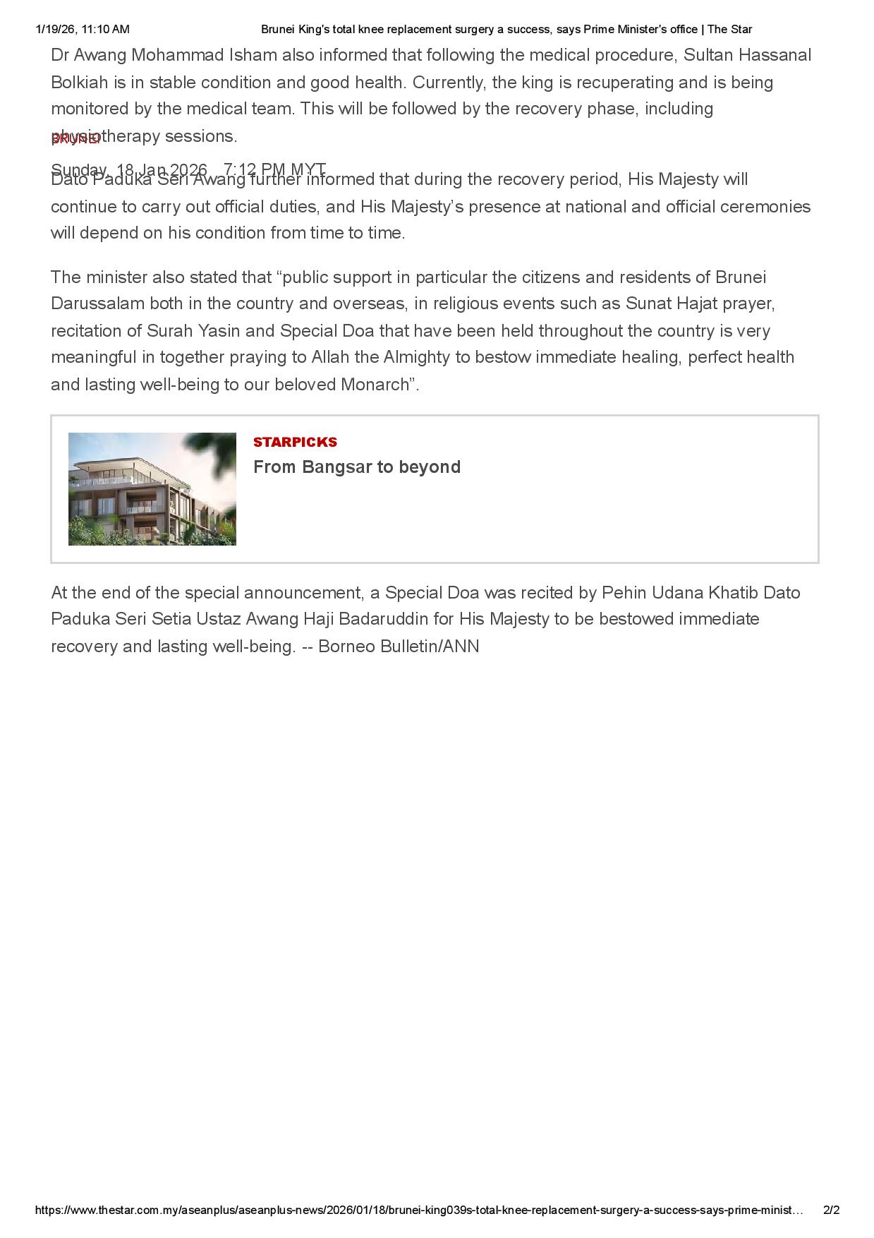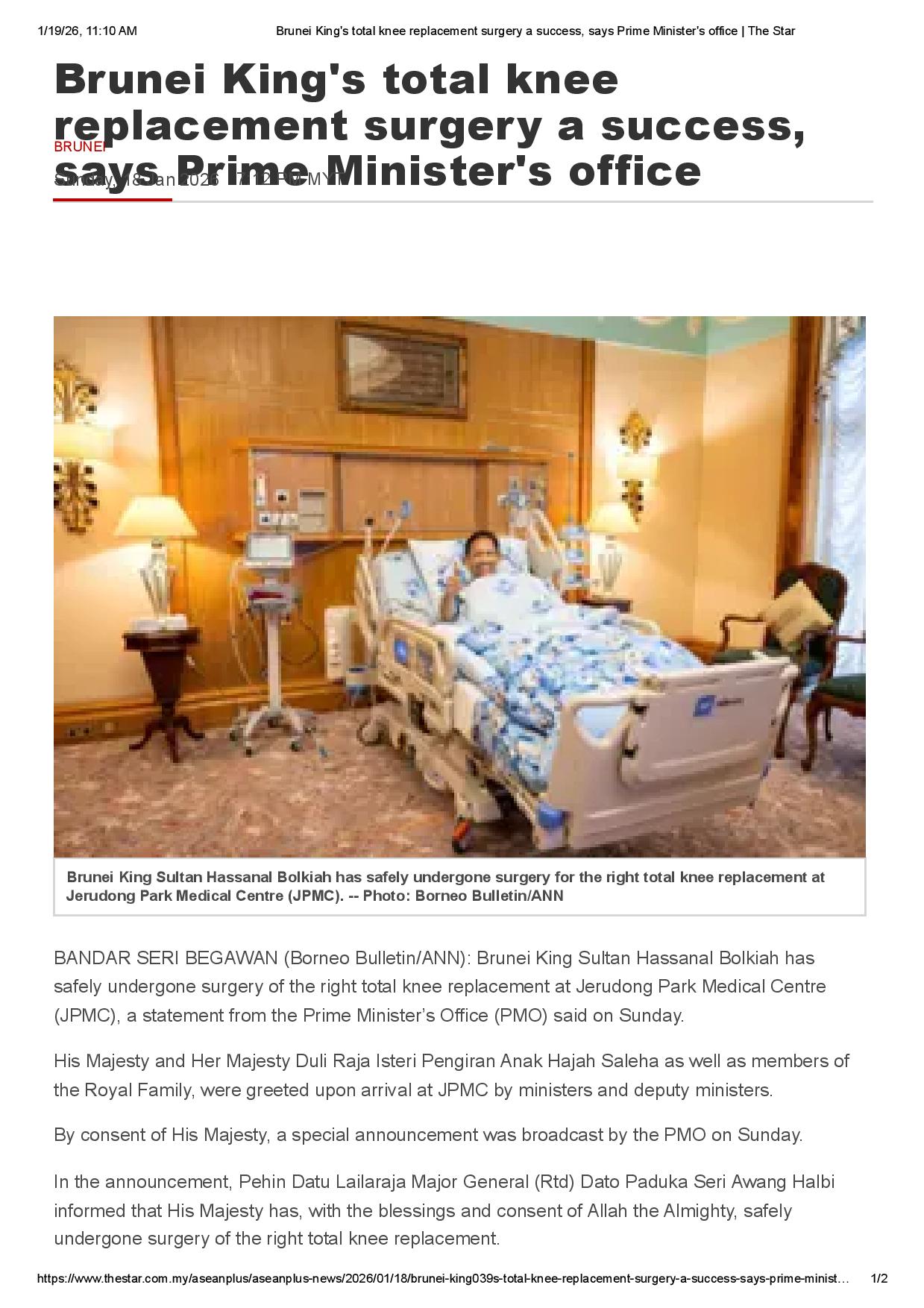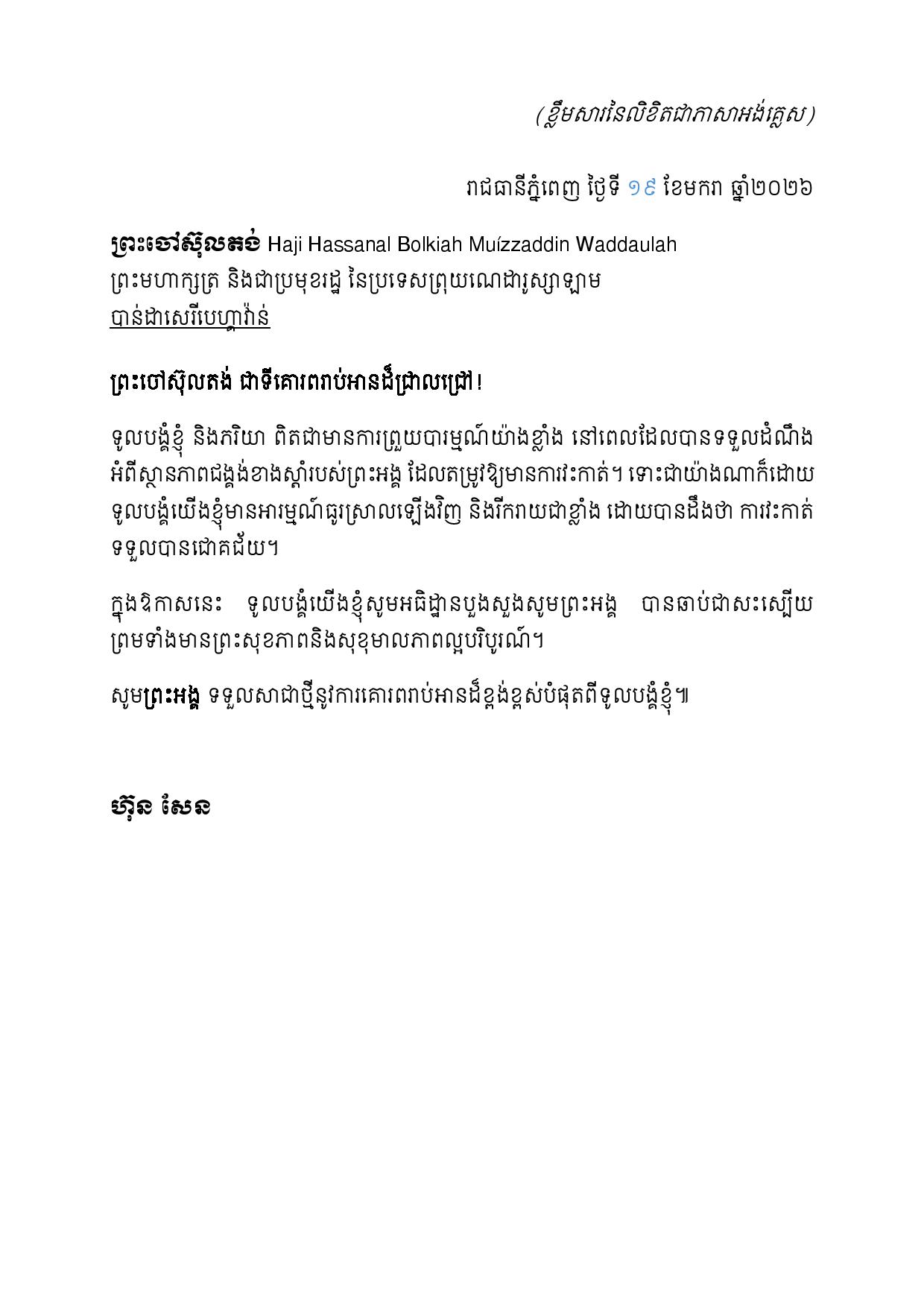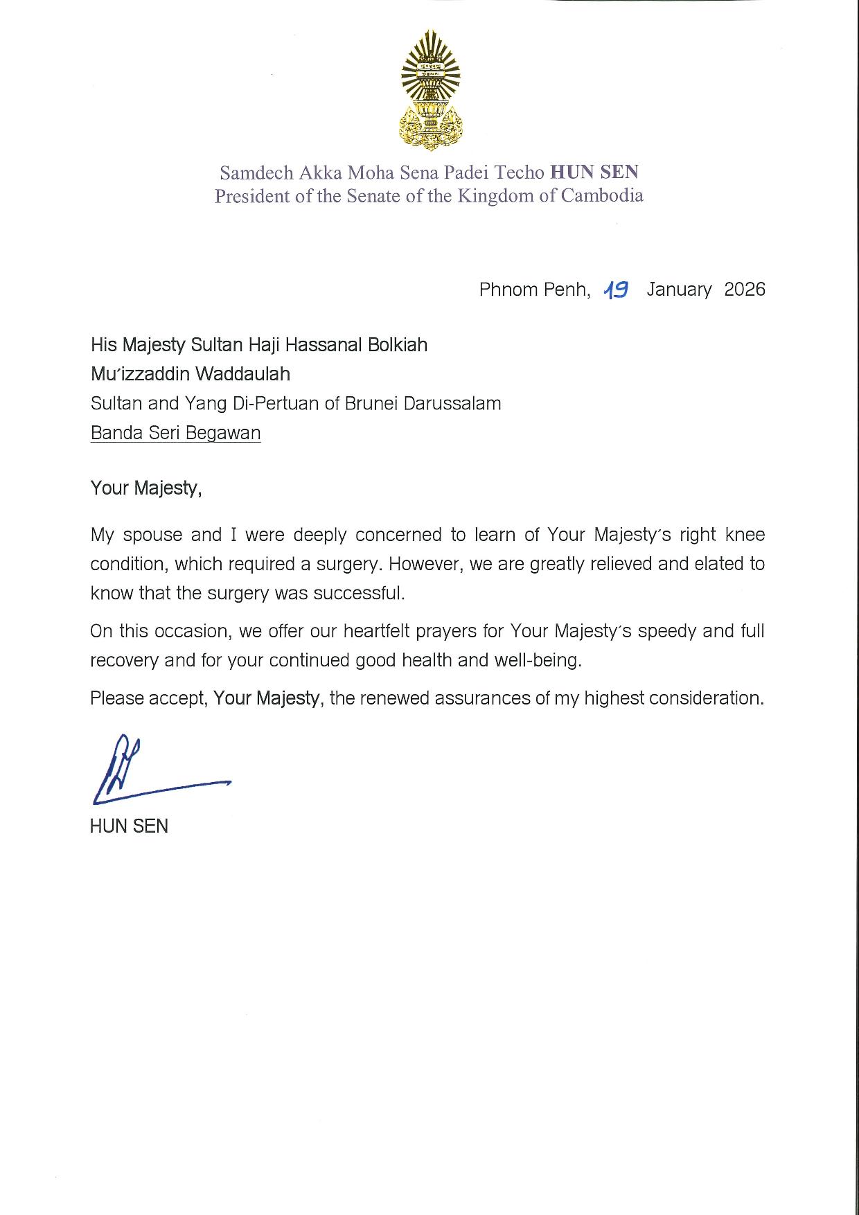 (ភ្នំពេញ)៖ សម្តេចតេជោ ហ៊ុន សែន ប្រធានព្រឹទ្ធសភាកម្ពុជា នៅថ្ងៃទី១៩ ខែមករា ឆ្នាំ២០២៦នេះ បានផ្ញើសារលិខិតថ្វាយ ព្រះចៅស៊ុលតង់ ព្រះមហាក្សត្រ និងជាប្រមុខរដ្ឋ នៃប្រទេសព្រុយណេ ដើម្បីបួងសួងសូមព្រះអង្គ បានឆាប់ជាសះស្បើយ ព្រមទាំងមានព្រះសុខភាពនិងសុខុមាលភាពល្អបរិបូរណ៍។