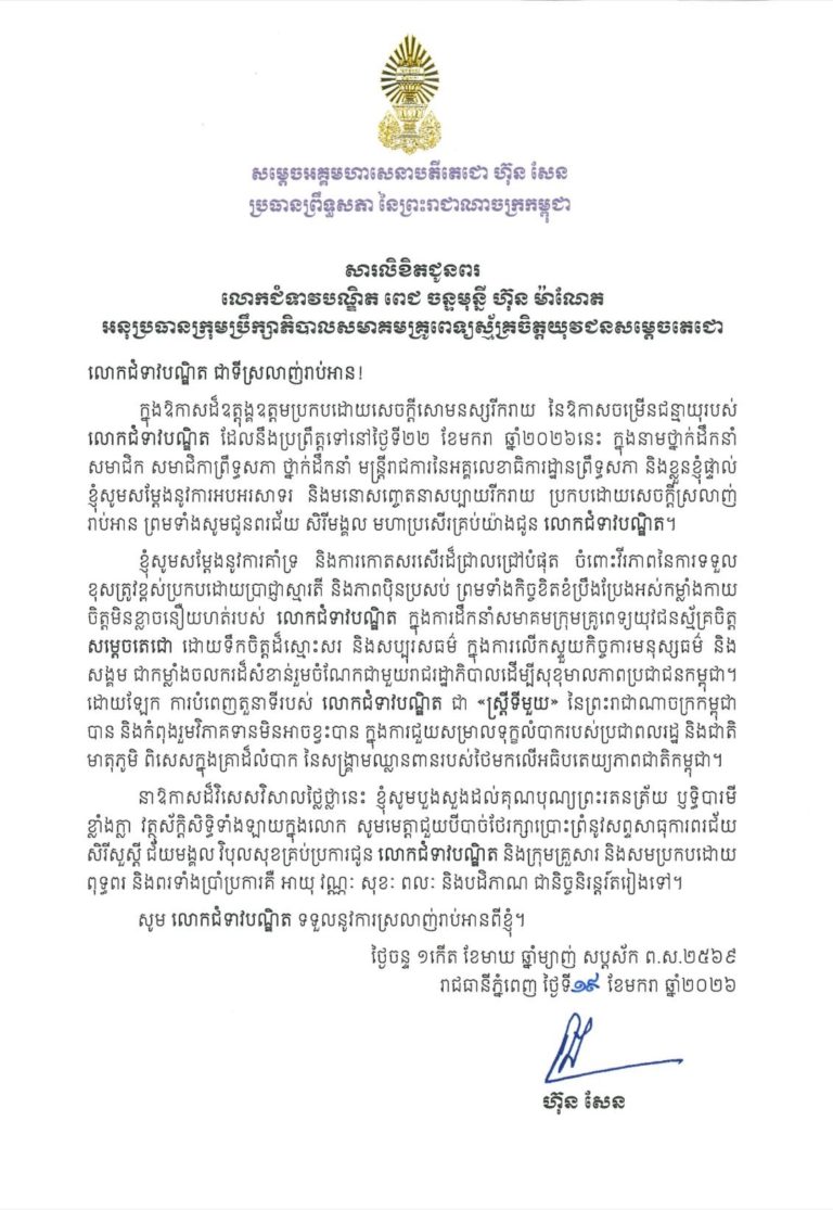 សម្តេចតេជោ ហ៊ុន សែន ផ្ញើសារលិខិតជូនពរ ជូនលោកជំទាវបណ្ឌិត ពេជ ចន្ទមុន្នី ហ៊ុន ម៉ាណែត ក្នុងឱកាសខួបចម្រើនជន្មាយុ នាថ្ងៃទី២២ ខែមករា ឆ្នាំ២០២៦