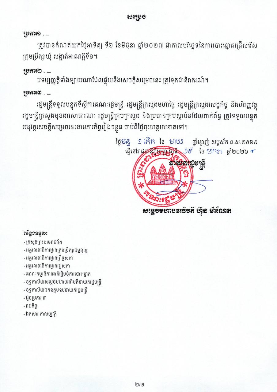 សម្តេចបវរធិបតី ហ៊ុន ម៉ាណែត ប្រមុខរាជរដ្ឋាភិបាលកម្ពុជា បានចេញសេចក្តីសម្រេចយកថ្ងៃអាទិត្យ ទី៦ ខែមិថុនា ឆ្នាំ២០២៧ ជាថ្ងៃបោះឆ្នោតឃុំ/សង្កាត់អាណត្តិទី៦។