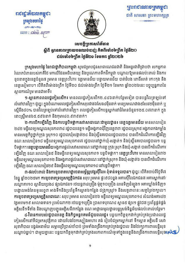 ក្រសួងមហាផ្ទៃ ៖ ក្នុងចំណោមពលរដ្ឋភៀសសឹកសរុបជាង ៦សែន ៤ម៉ឺននាក់ មានប្រមាណជាង ៥សែន ២ម៉ឺននាក់ ឬស្មើនឹង ៨០% បានវិលត្រឡប់ទៅលំនៅឋានវិញ Posted on ថ្ងៃពុធ, 21 ខែមករា, 2026ថ្ងៃពុធ, 21 ខែមករា, 2026 អត្ថបទដោយ MET KIM AU