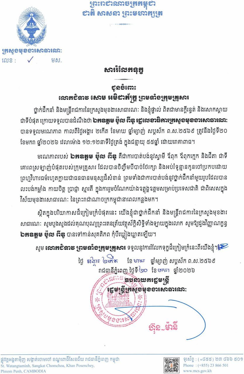 ក្នុងបរិយាកាសដ៏ក្រៀមក្រំបំផុតនេះ ថ្នាក់ដឹកនាំ និងមន្ត្រីរាជការនៃក្រសួងមុខងារសាធារណៈគ្រប់រូប សូមបួងសួងដល់គុណបុណ្យព្រះរតនត្រ័យ និងវត្ថុស័ក្តិសិទ្ធិទាំងឡាយក្នុងលោក សូមឲ្យដួងវិញ្ញាណក្ខន្ធ ឯកឧត្តម ប៉ូល ពីឌូ បានទៅកាន់សុគតិភព កុំបីឃ្លៀងឃ្លាតឡើយ៕