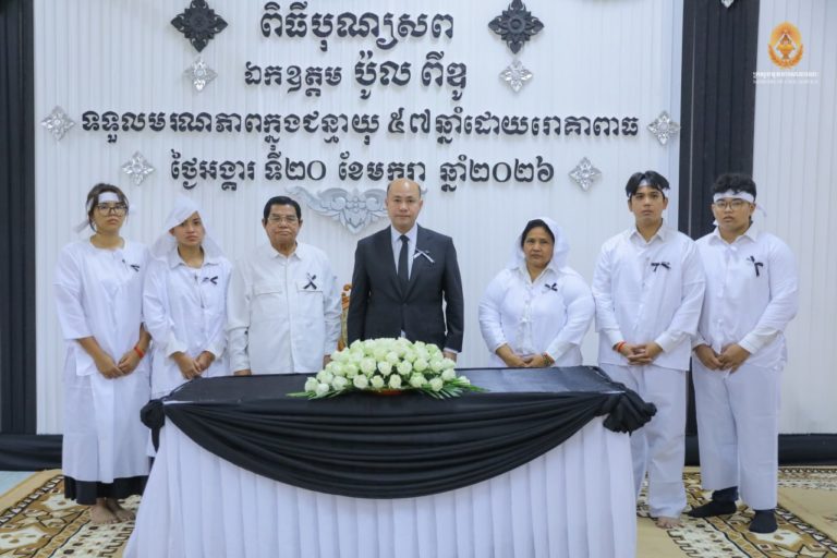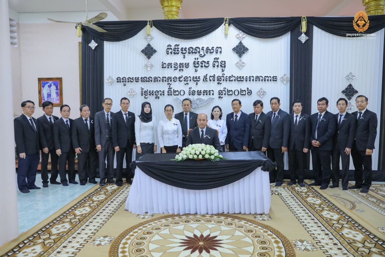 (ភ្នំពេញ)៖ ឯកឧត្តមឧបនាយករដ្ឋមន្ដ្រី ហ៊ុន ម៉ានី រដ្ឋមន្ដ្រីក្រសួងមុខងារសាធារណៈ នៅព្រឹកថ្ងៃទី២១ ខែមករា ឆ្នាំ២០២៦នេះ បានដឹកនាំថ្នាក់ដឹកនាំ មន្ត្រីរាជការ នៃក្រសួងមុខងារសាធារណៈ អញ្ជើញគោរពវិញ្ញាណក្ខន្ធ ឯកឧត្តម ប៉ូល ពីឌូ រដ្ឋលេខាធិការក្រសួងមុខងារសាធារណៈ ដែលបានទទួលមរណភាព កាលពីថ្ងៃទី២០ ខែមករា ឆ្នាំ២០២៦ វេលាម៉ោង១២៖១២នាទីថ្ងៃត្រង់ ក្នុងជន្មាយុ ៥៥ឆ្នាំ។
