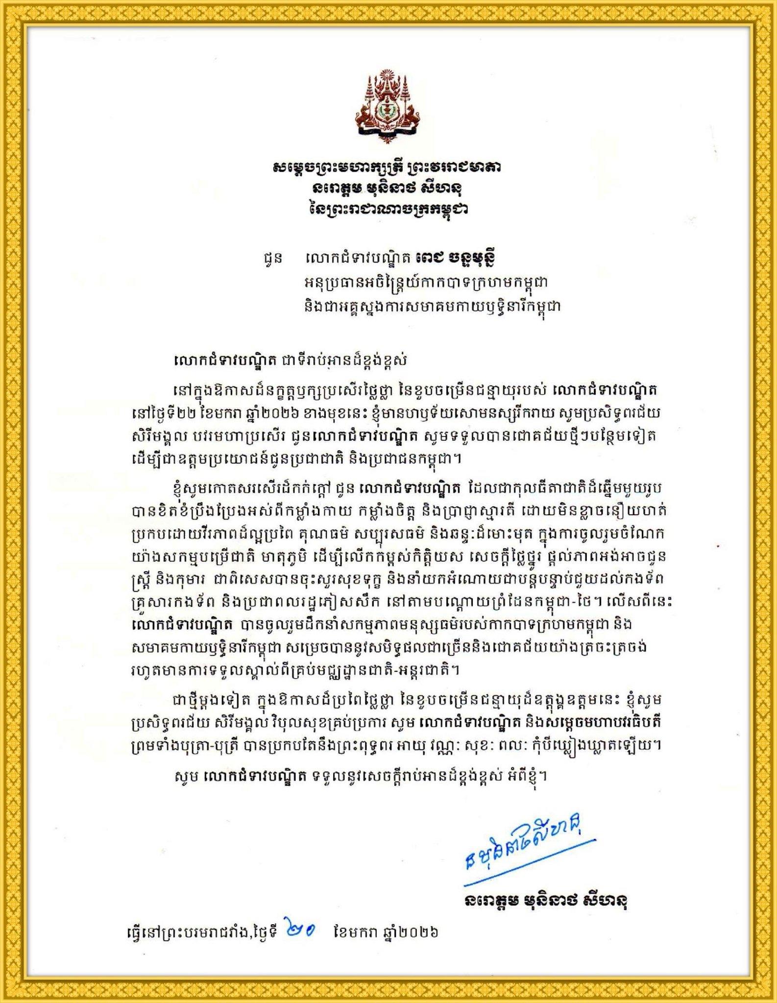 (ភ្នំពេញ)៖ សម្តេចព្រះមហាក្សត្រី ព្រះវររាជមាតា នរោត្តម មុនិនាថ សីហនុ នៃព្រះរាជាណាចក្រកម្ពុជា បានផ្ញើសារលិខិតជូនពរ លោកជំទាវបណ្ឌិត ពេជ ចន្ទមុន្នី អនុប្រធានអចិន្ត្រៃយ៍កាកបាទក្រហមកម្ពុជា និងជាអគ្គស្នងការសមាគមកាយឫទ្ធិនារីកម្ពុជា ក្នុងឱកាសខួបចម្រើនជន្មាយុ នៅថ្ងៃទី២២ ខែមករា ឆ្នាំ២០២៦។