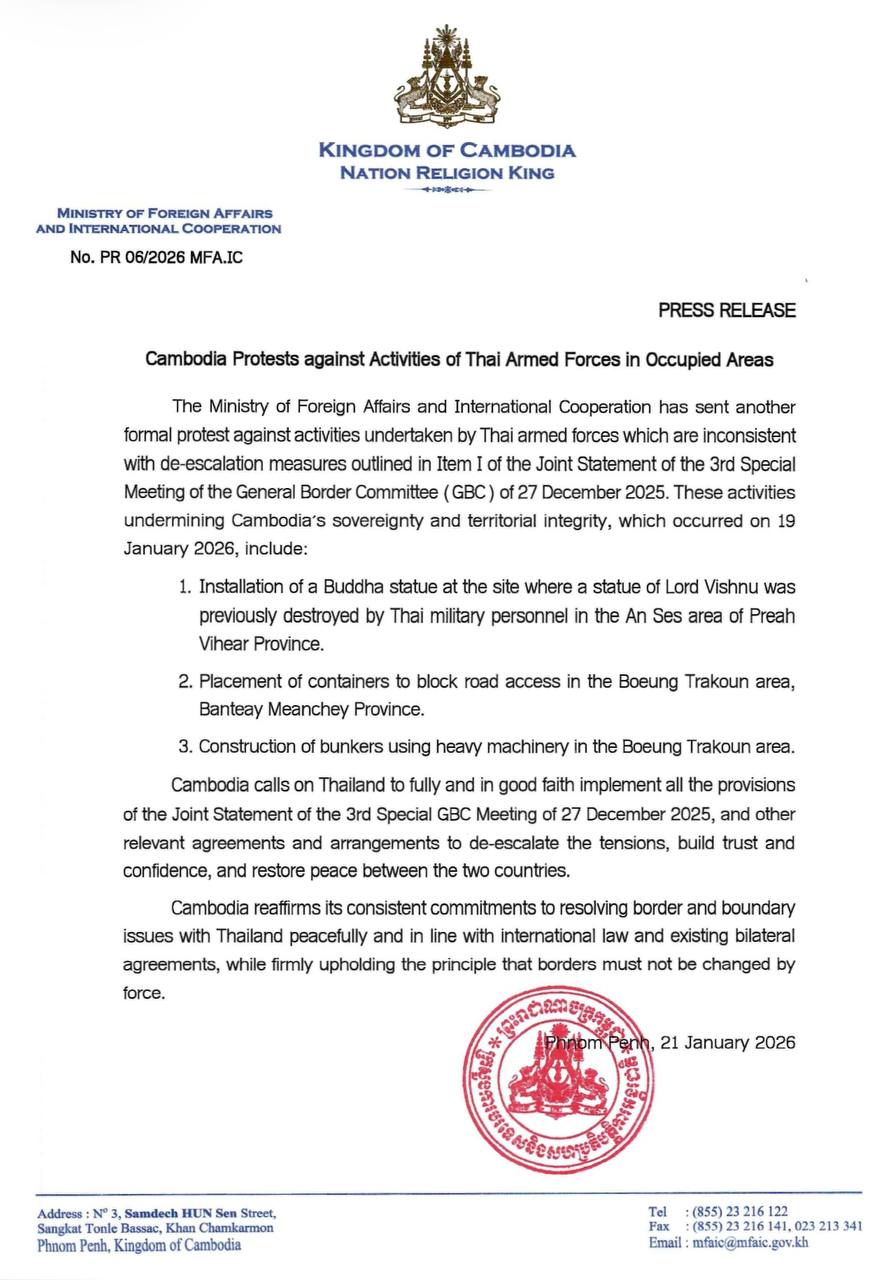 (ភ្នំពេញ)៖ ក្រសួងការបរទេស និងសហប្រតិបត្តិការអន្តរជាតិ បានតវ៉ាផ្លូវការជាថ្មីម្ដងទៀតប្រឆាំងចំពោះសកម្មភាពរបស់កងកម្លាំងប្រដាប់អាវុធថៃ ដែលផ្ទុយទៅនឹងវិធានការកាត់បន្ថយភាពតានតឹង ដែលមានចែងក្នុងចំណុចទី១ នៃសេចក្តីប្រកាសរួម នៃកិច្ចប្រជុំពិសេសលើកទី៣ របស់គណៈកម្មាធិការព្រំដែន ទូទៅ (GBC) ចុះថ្ងៃទី២៧ ខែធ្នូ ឆ្នាំ២០២៥។