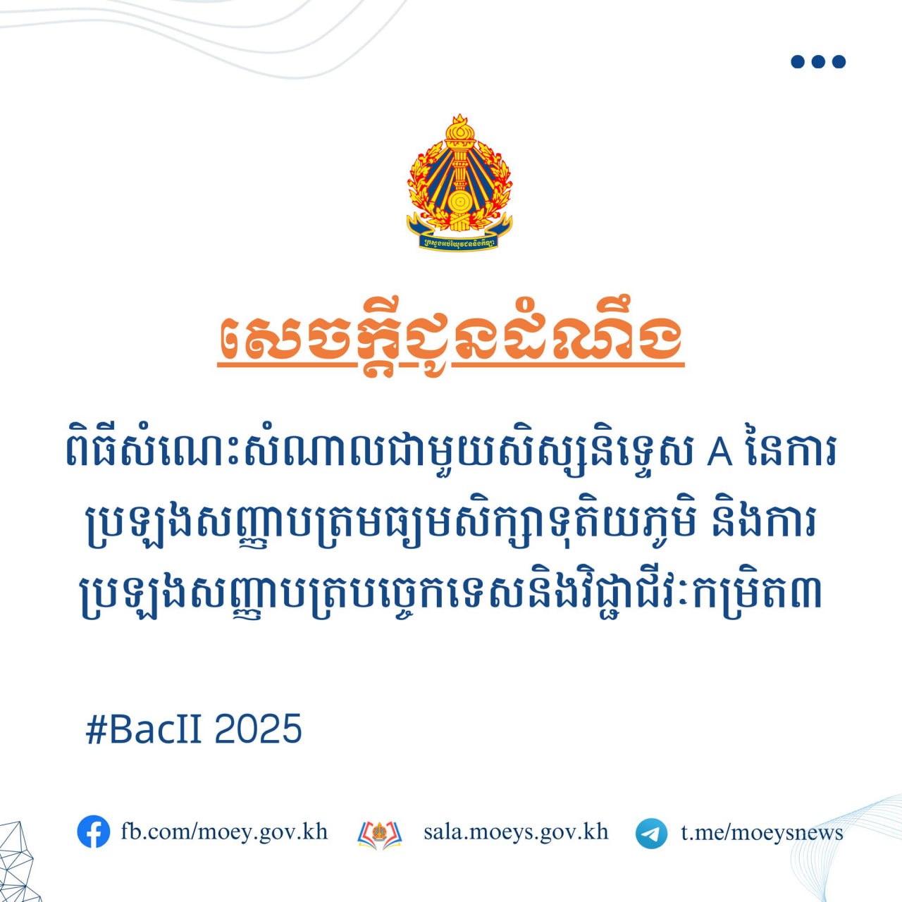 សូមជម្រាបថា ការប្រឡងសញ្ញាបត្រមធ្យមសិក្សាទុតិយភូមិ (បាក់ឌុប) សម័យប្រឡង ៖ ២៨ សីហា ២០២៥ មានបេក្ខជនប្រឡងជាប់សរុប ១២២,៤៧៣នាក់ ត្រូវជា៨៤.៥៦ភាគរយ នៃចំនួនបេក្ខជនមកប្រឡង។