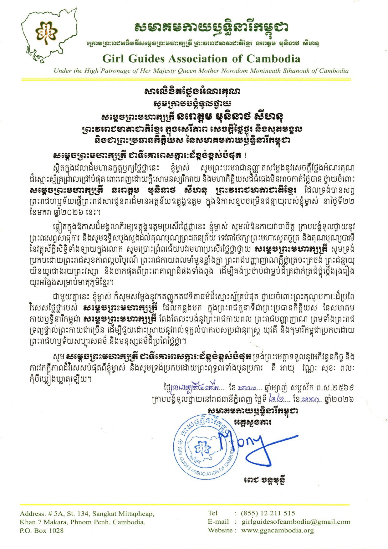 សូម សម្ដេចព្រះមហាក្សត្រី ជាទីគោរពសក្ការៈដ៏ខ្ពង់ខ្ពស់បំផុត ទ្រង់ព្រះមេត្តាទទួលនូវអភិវន្ទនកិច្ច និងគារវភក្ដីភាពដ៏វិសេសបំផុតពីខ្ញុំម្ចាស់ និងសូមទ្រង់ប្រកបដោយព្រះពុទ្ធពរទាំងបួនប្រការ គឺ អាយុ វណ្ណៈ សុខៈ ពលៈ កុំបីឃ្លៀងឃ្លាតឡើយ»៕