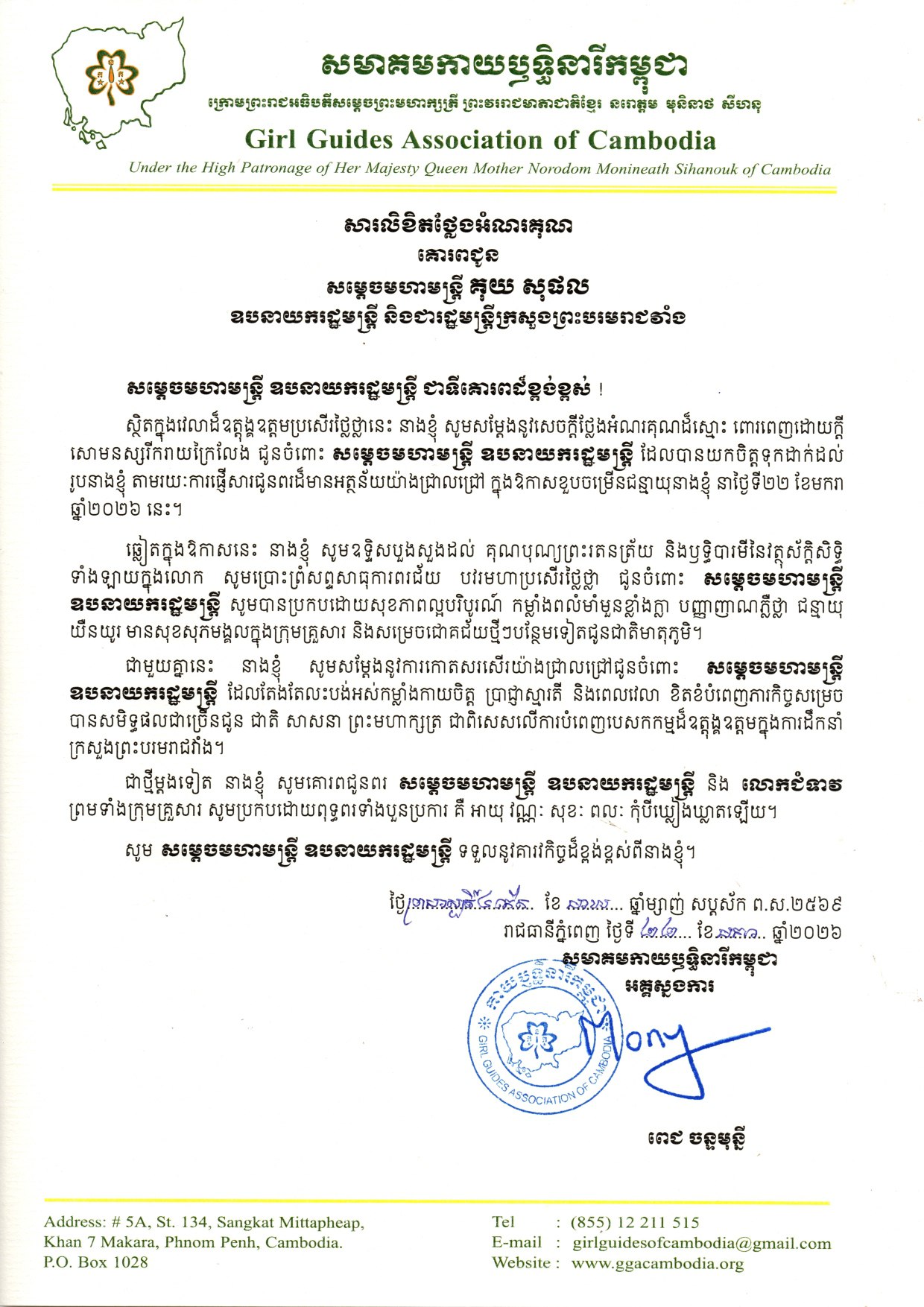 (ភ្នំពេញ)៖ លោកជំទាវបណ្ឌិត ពេជ ចន្ទមុន្នី ហ៊ុនម៉ាណែត អគ្គស្នងការសមាគមកាយឫទ្ធិនារីកម្ពុជា បានផ្ញើសារលិខិត សូមថ្លែងអំណរគុណដោយក្តីគោរពជូន សម្តេចមហាមន្ត្រី គុយ សុផល ឧបនាយករដ្ឋមន្ត្រី រដ្ឋមន្ត្រីក្រសួងព្រះបរមរាជវាំង ចំពោះសារលិខិតជូនពរប្រកបទៅដោយអត្ថន័យយ៉ាងជ្រាលជ្រៅក្នុងថ្ងៃខួបកំណើតរបស់ លោកជំទាវបណ្ឌិត នាថ្ងៃទី២២ ខែមករា ឆ្នាំ២០២៦ នេះ។