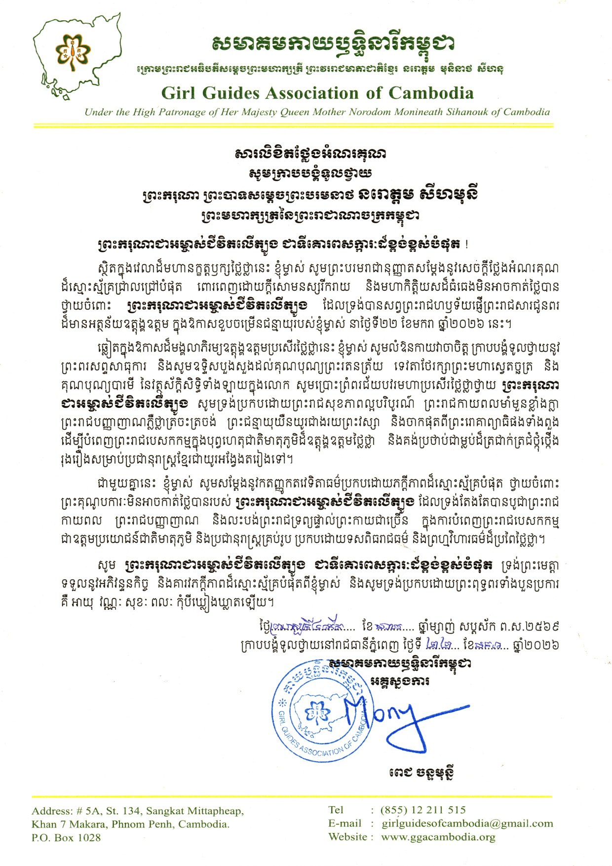 សូម ព្រះករុណាជាអម្ចាស់ជីវិតលើត្បូង ជាទីគោរពសក្ការៈដ៏ខ្ពង់ខ្ពស់បំផុត ទ្រង់ព្រះមេត្តាទទួលនូវអភិវន្ទនកិច្ច និងគារវភក្ដីភាពដ៏ស្មោះស្ម័គ្របំផុតពីខ្ញុំម្ចាស់ និងសូមទ្រង់ប្រកបដោយព្រះពុទ្ធពរទាំងបួនប្រការ គឺ អាយុ វណ្ណៈ សុខៈ ពលៈ កុំបីឃ្លៀងឃ្លាតឡើយ»៕