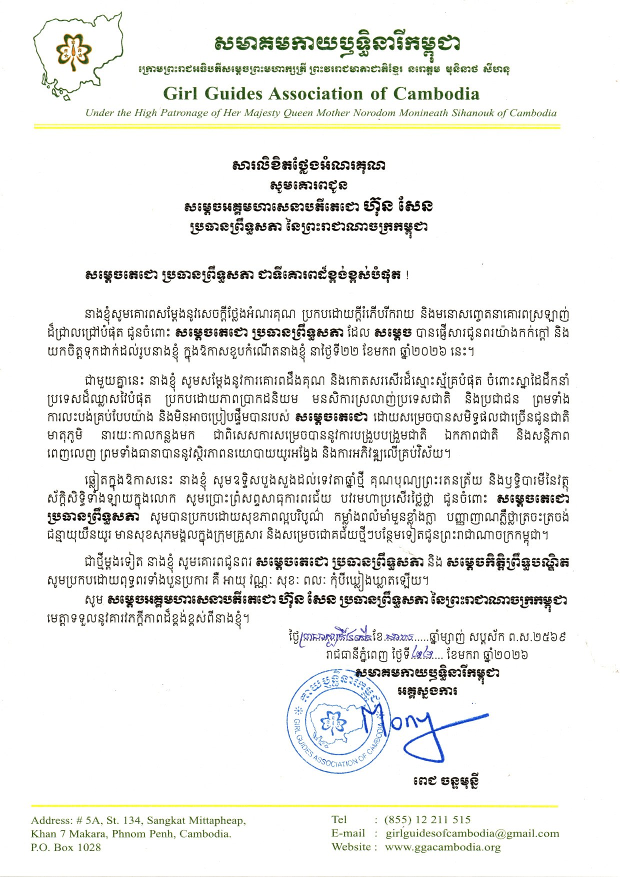 (ភ្នំពេញ)៖ លោកជំទាវបណ្ឌិត ពេជ ចន្ទមុន្នី ហ៊ុនម៉ាណែត អគ្គស្នងការសមាគមកាយឫទ្ធិនារីកម្ពុជា បានផ្ញើសារលិខិត សូមថ្លែងអំណរគុណដោយក្តីគោរពជូន សម្តេចអគ្គមហាសេនាបតីតេជោ ហ៊ុន សែន ប្រធានឧត្តមក្រុមប្រឹក្សាផ្ទាល់ព្រះមហាក្សត្រ និងជាប្រធានព្រឹទ្ធសភានៃព្រះរាជាណាចក្រកម្ពុជា ចំពោះសារលិខិតជូនពរ លោកជំទាវបណ្ឌិត ប្រកបទៅដោយអត្ថន័យយ៉ាងកក់ក្តៅ និងយកចិត្តទុកដាក់ ក្នុងថ្ងៃខួបកំណើតរបស់ លោកជំទាវបណ្ឌិត នាថ្ងៃទី២២ ខែមករា ឆ្នាំ២០២៦នេះ។
