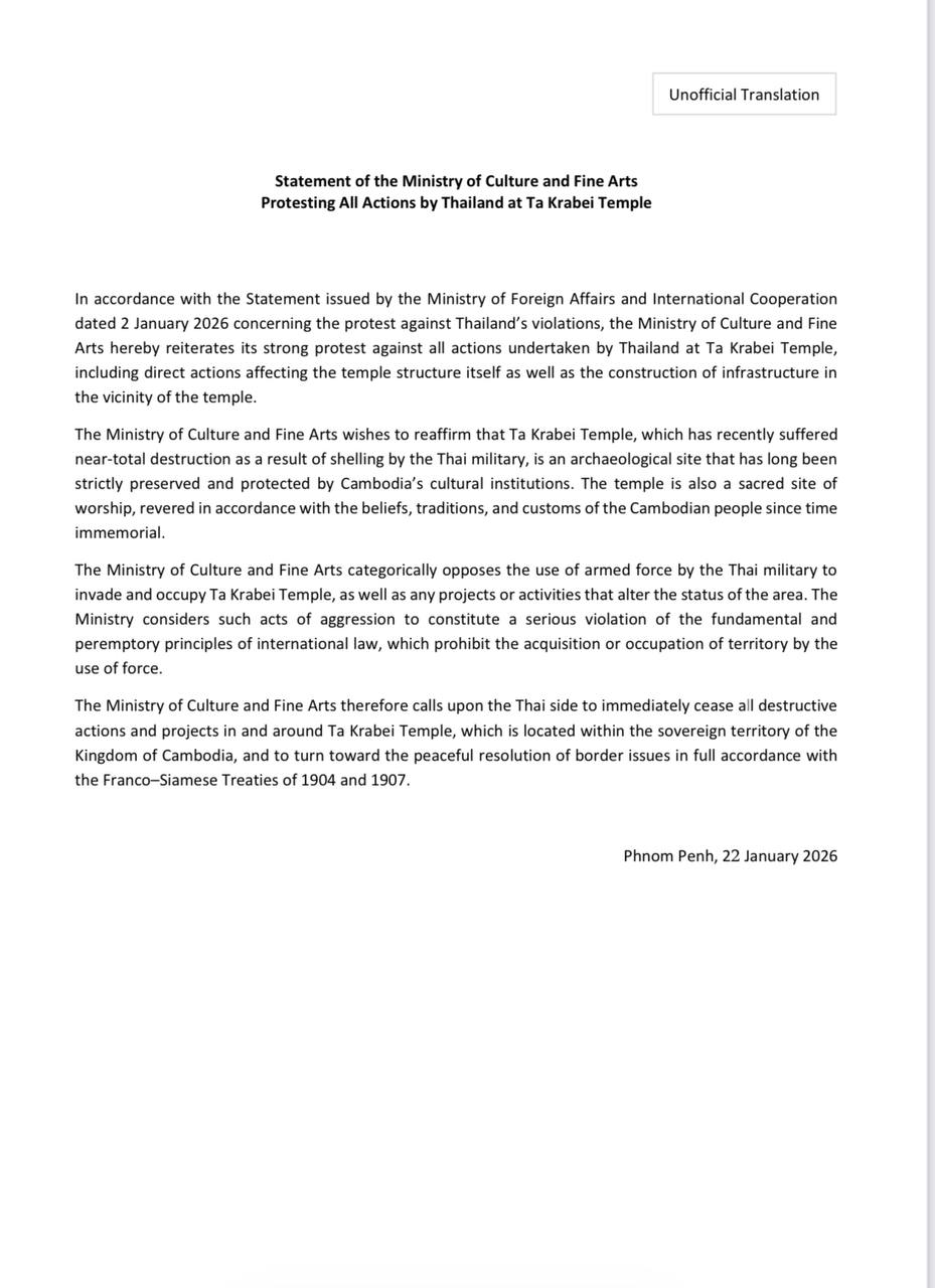 (ភ្នំពេញ)៖ ក្រសួងវប្បធម៌ និងវិចិត្រសិល្បៈកម្ពុជា នៅថ្ងៃទី២២ ខែមករា ឆ្នាំ២០២៦នេះ បានចេញសេចក្តីថ្លែងការណ៍ប្រឆាំង ចំពោះគ្រប់សកម្មភាពរបស់ប្រទេសថៃ នៅប្រាសាទតាក្របី។