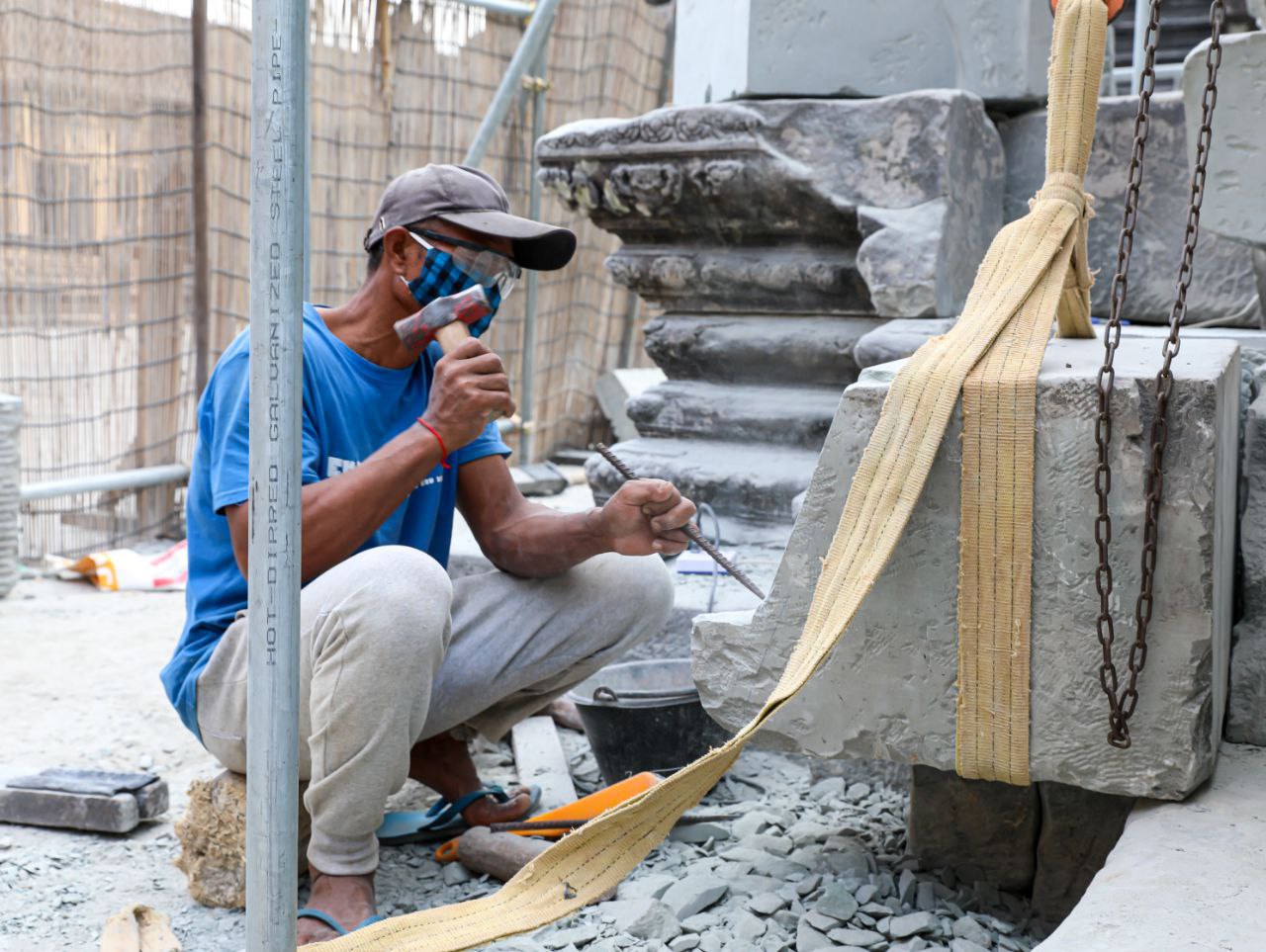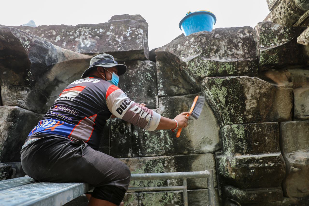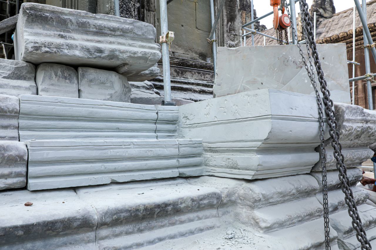 ស្របជាមួយគ្នានេះដែរ ក្រុមការងារអភិរក្សថ្ម ក៏បានប្រើបច្ចេកទេសជួសជុលពង្រឹងផ្នែកថ្ម ដែលពុកផុយឱ្យរឹងមាំឡើងវិញ រួមមាន សសរ ជញ្ជាំង មេទ្វារ និងរូបអប្សរាមួយចំនួន។