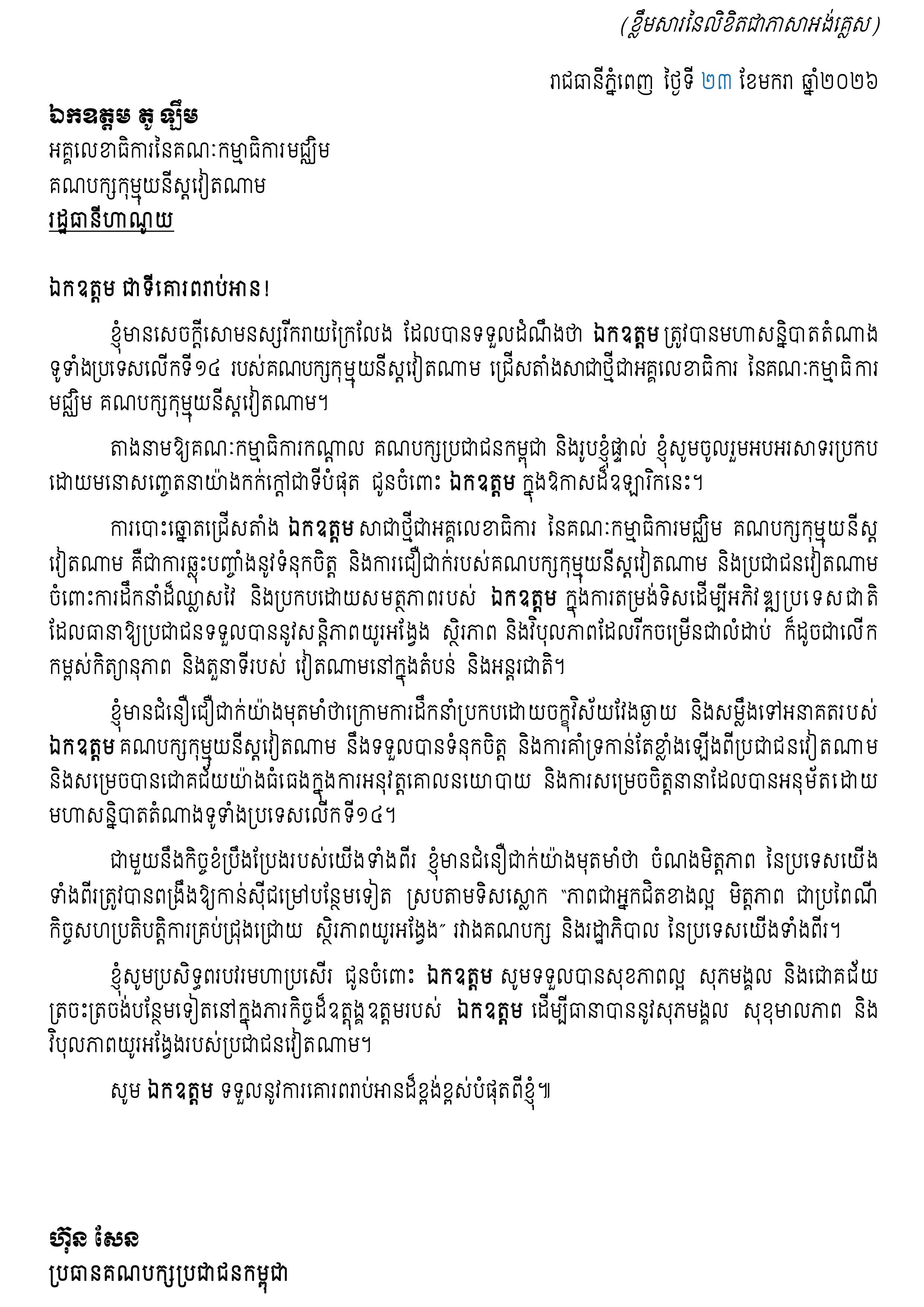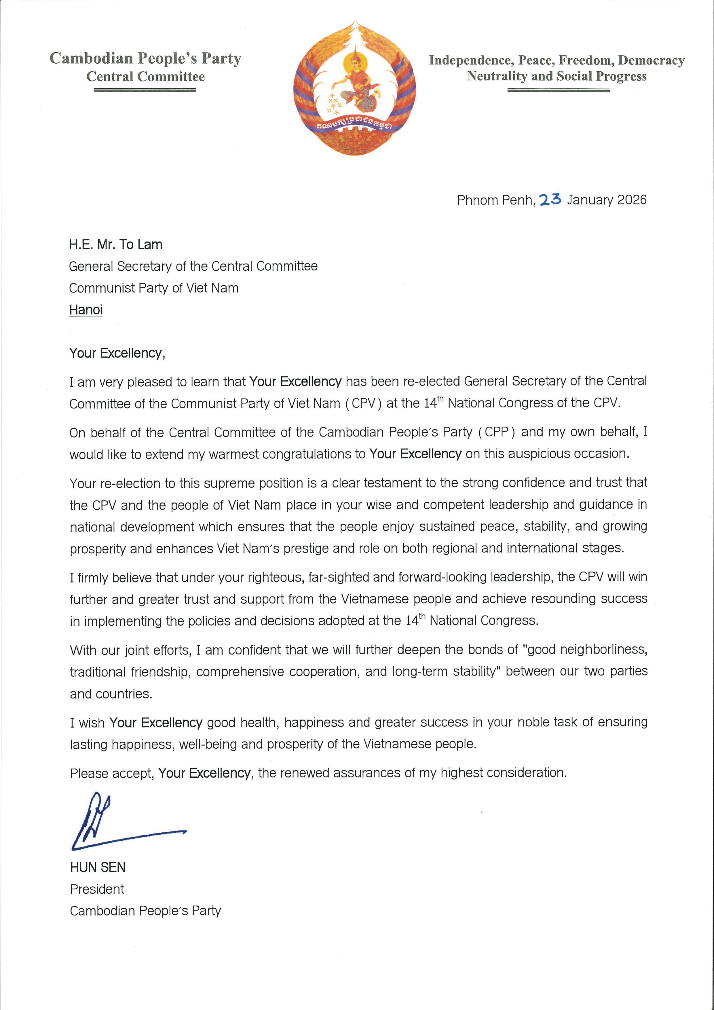 សម្តេចអគ្គមហាសេនាបតីតេជោ ហ៊ុន សែន ប្រធានគណបក្សប្រជាជនកម្ពុជា នៅថ្ងៃទី២៣ ខែមករា ឆ្នាំ២០២៦នេះ បានផ្ញើសារលិខិតអបអរសាទរ ជូន លោក To Lam ក្នុងឱកាសដែលឯកឧត្តមត្រូវបានមហាសន្និបាតតំណាងទូទាំងប្រទេសលើកទី១៤ របស់គណបក្សកុម្មុយនីស្តវៀតណាម ជ្រើសតាំងសាជាថ្មីជាអគ្គលេខាធិការ នៃគណៈកម្មាធិការមជ្ឍិម គណបក្សកុម្មុយនីស្តវៀតណាម។