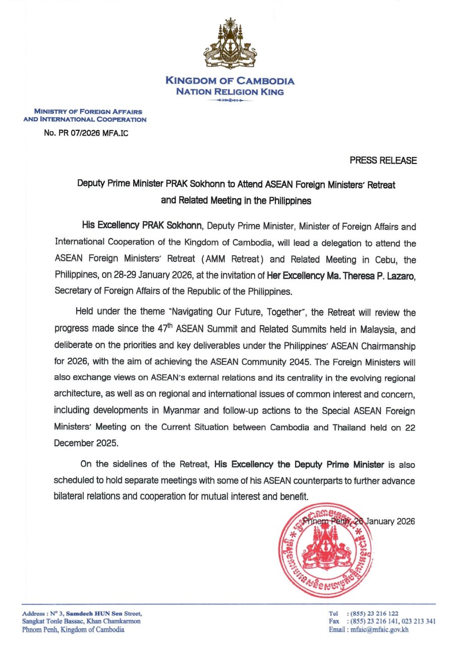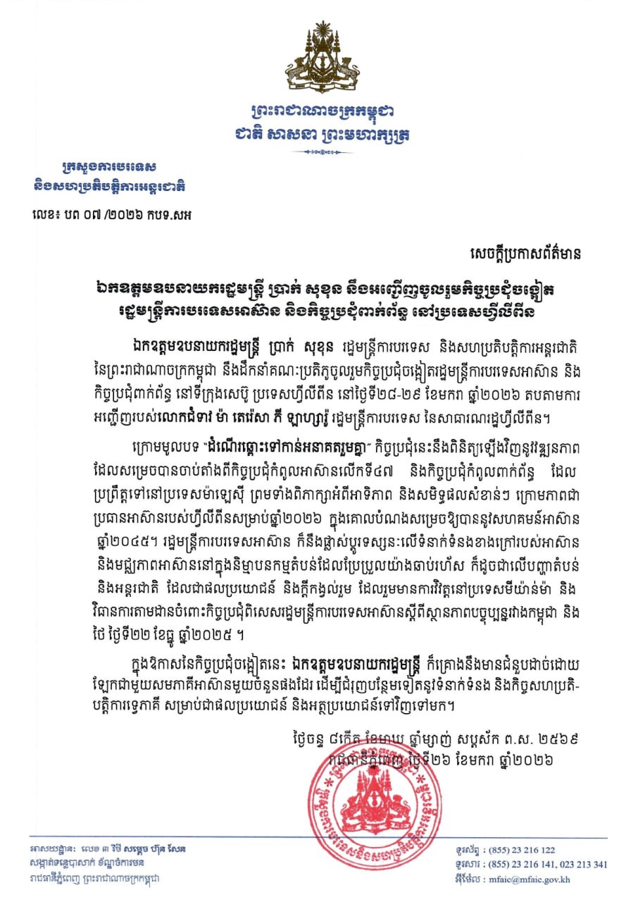 ឯកឧត្តមឧបនាយករដ្ឋមន្ត្រី ប្រាក់ សុខុន រដ្ឋមន្ត្រីការបរទេស និងសហប្រតិបត្តិការអន្តរជាតិ នឹងដឹកនាំគណៈប្រតិភូចូលរួមកិច្ចប្រជុំចង្អៀតរដ្ឋមន្ត្រីការបរទេសអាស៊ាន និងកិច្ចប្រជុំពាក់ព័ន្ធ នៅទីក្រុងសេប៊ូ ប្រទេសហ្វីលីពីន នៅថ្ងៃទី២៨-២៩ ខែមករា ឆ្នាំ២០២៦ តបតាមការអញ្ជើញរបស់លោកស្រី ម៉ា តេរ៉េសា ភី ឡាហ្សារ៉ូ រដ្ឋមន្ត្រីការបរទេស នៃសាធារណរដ្ឋហ្វីលីពីន។