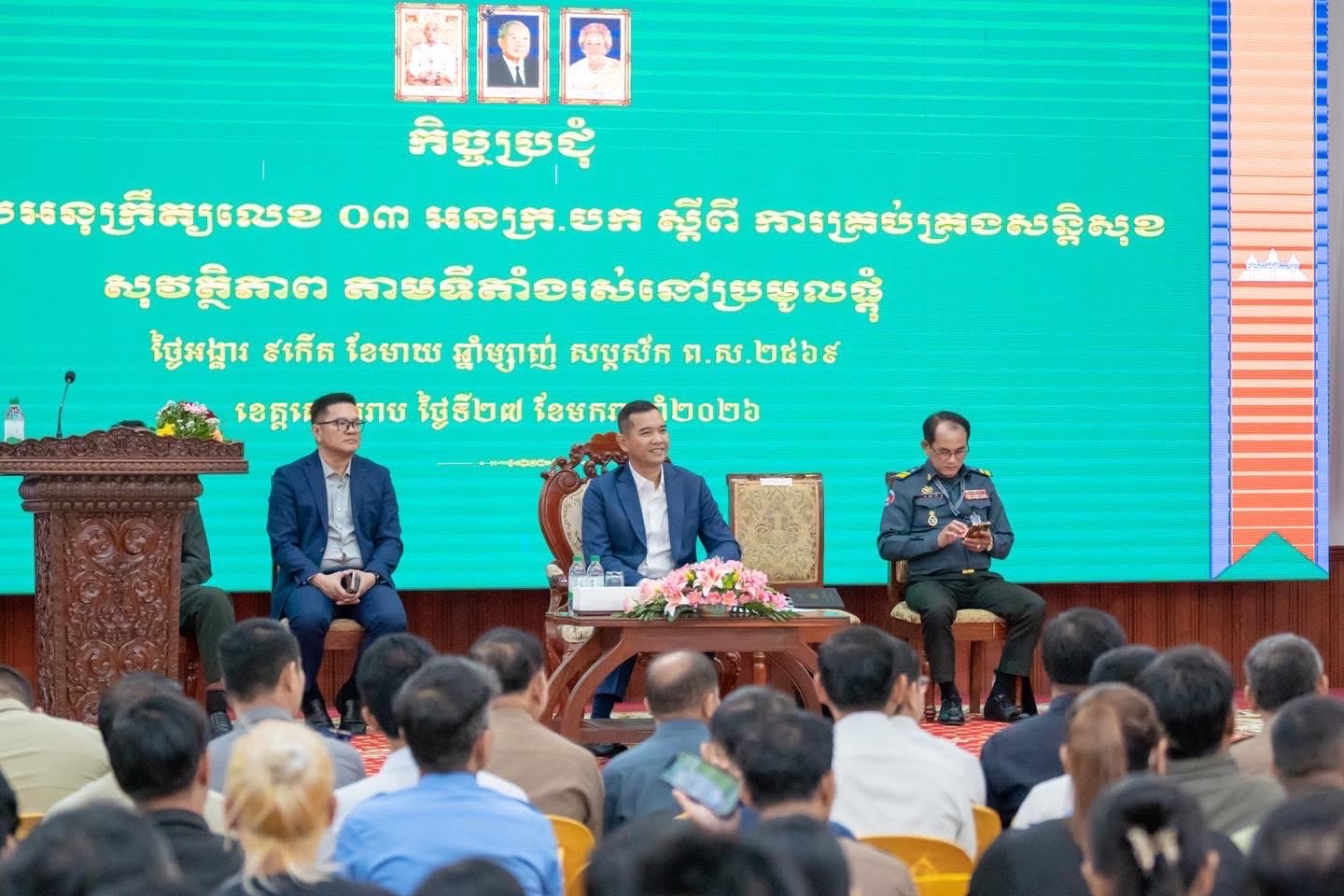 នៅព្រឹកថ្ងៃទី២៧ ខែមករា ឆ្នាំ២០២៦ នៅសាលាខេត្តសៀមរាប ឯកឧត្តម ប្រាក់ សោភ័ណ អភិបាលនៃគណៈអភិបាលខេត្តសៀមរាប បានដឹកនាំកិច្ចប្រជុំផ្សព្វផ្សាយអនុក្រឹត្យលេខ ០៣ អនក្រ.បក ស្តីពីការគ្រប់គ្រងសន្តិសុខ សុវត្ថិភាព តាមទីតាំងរស់នៅប្រមូលផ្តុំ ក្នុងភូមិសាស្ត្រខេត្តសៀមរាប ដើម្បីធានាដល់សន្តិសុខ សុវត្ថិភាពសង្គម និងសណ្ដាប់ធ្នាប់សាធារណៈ និងដើម្បីមុខមាត់ខេត្តសៀមរាប ដែលជាខេត្តទេសចរណ៍របស់កម្ពុជាយើង។