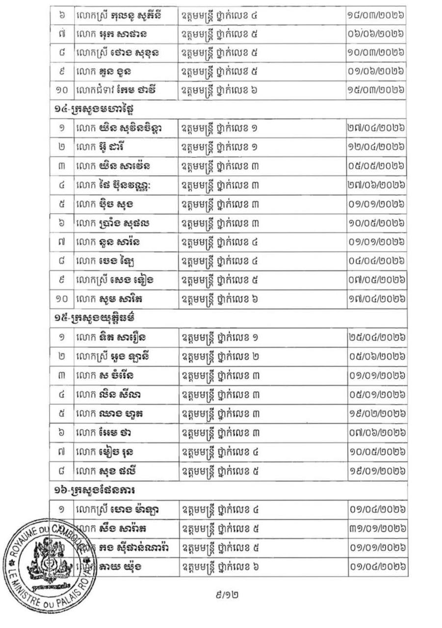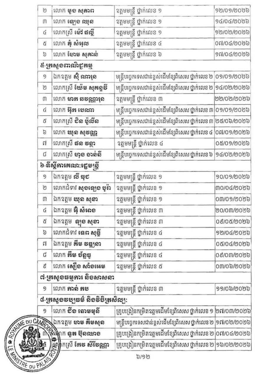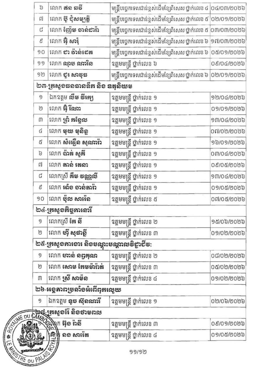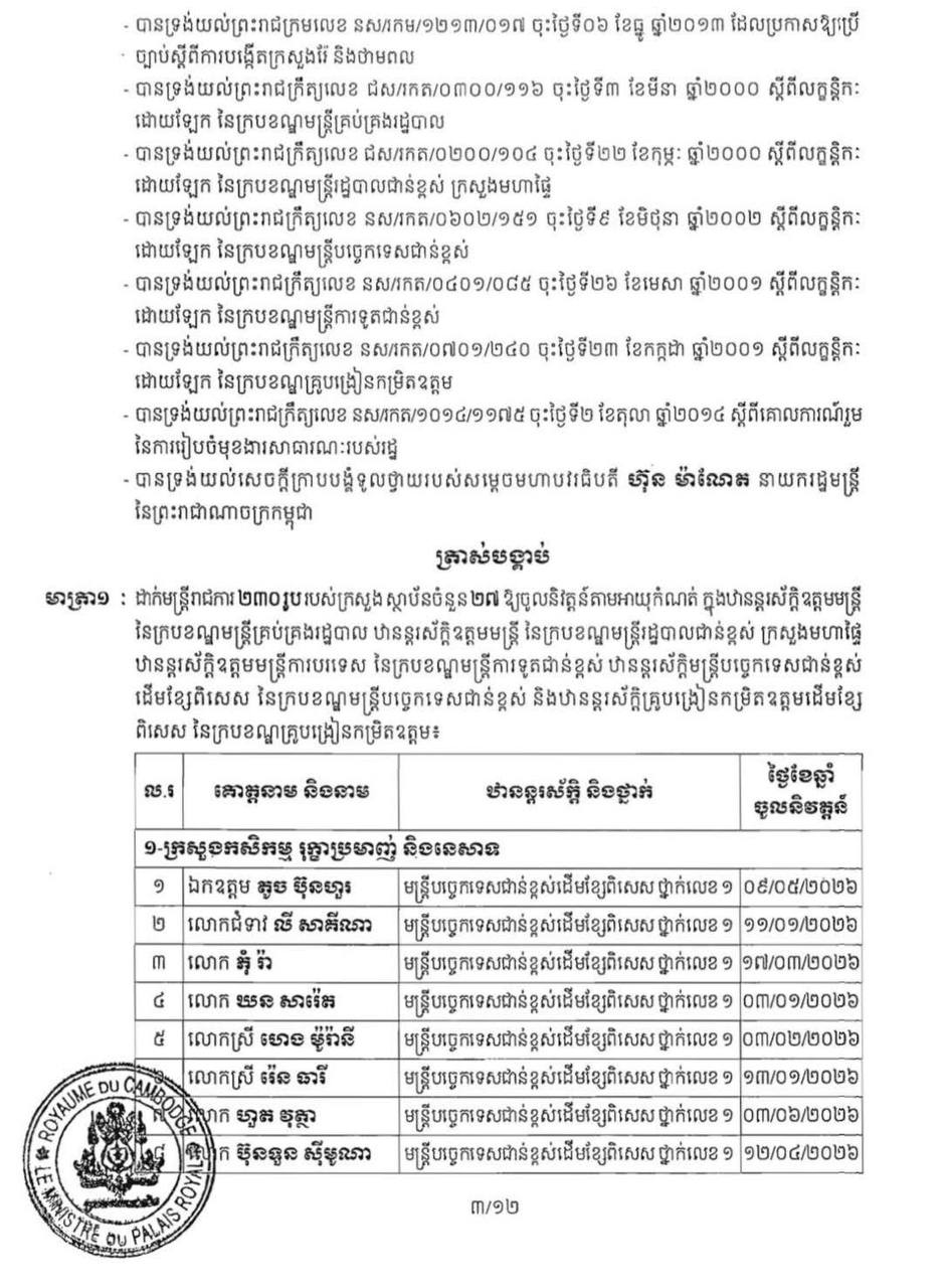 (ភ្នំពេញ)៖ ព្រះករុណា ព្រះបាទសម្ដេច ព្រះមរបនាថ នរោត្តម សីហមុនី ព្រះមហាក្សត្រនៃកម្ពុជា បានចេញព្រះរាជក្រឹត្យត្រាស់បង្គាប់ដាក់ឲ្យមន្ដ្រីរាជការ ចំនួន២៣០នាក់ របស់ក្រសួង ស្ថាប័ន ចំនួន២៧ ចូលនិវត្តន៍តាមអាយុកំណត់។ នេះបើតាមព្រះរាជក្រឹត្យដែលបណ្ដាញព័ត៌មាន ទទួលបាននៅព្រឹកថ្ងៃទី២៨ ខែមករា ឆ្នាំ២០២៦។