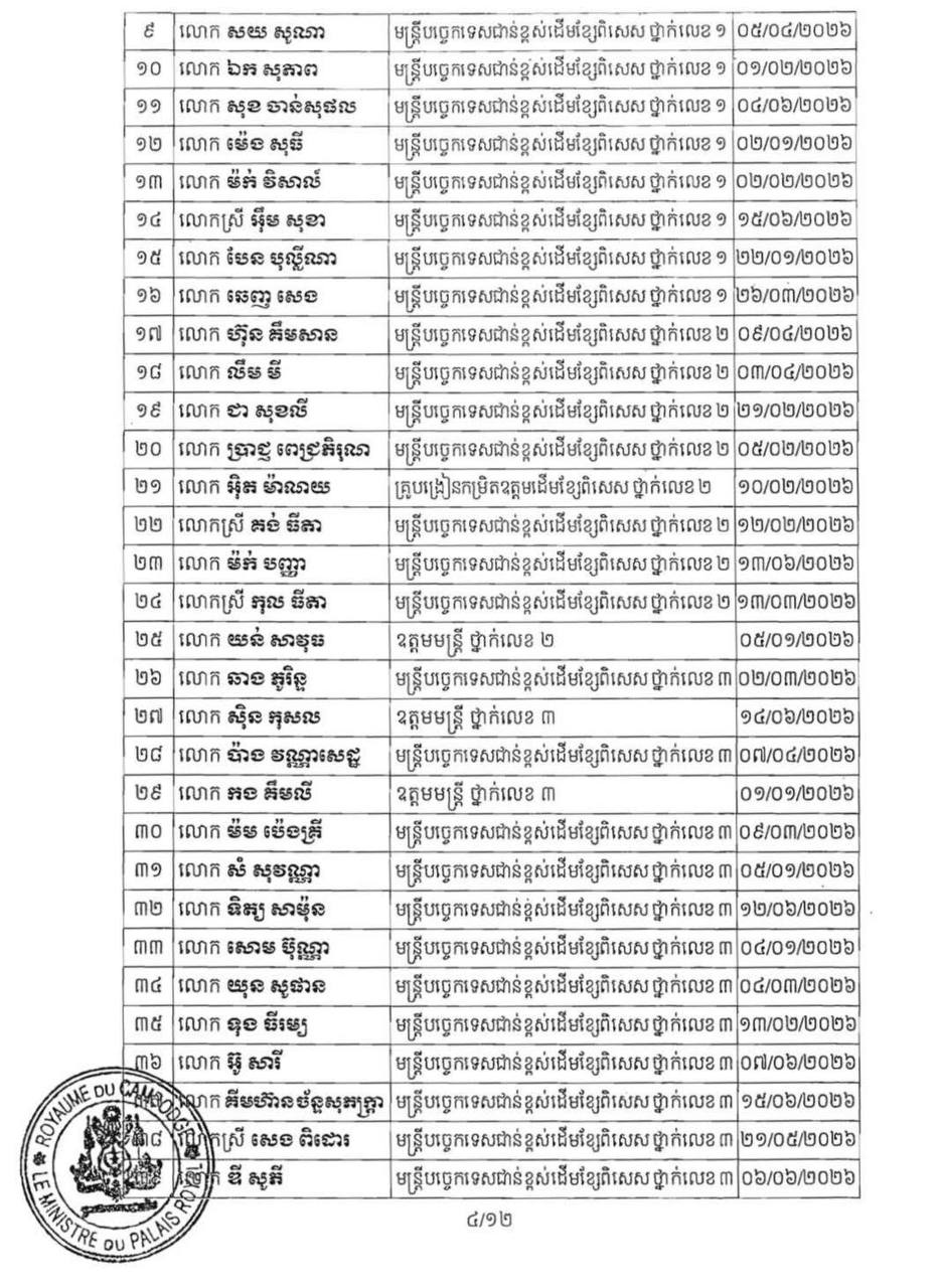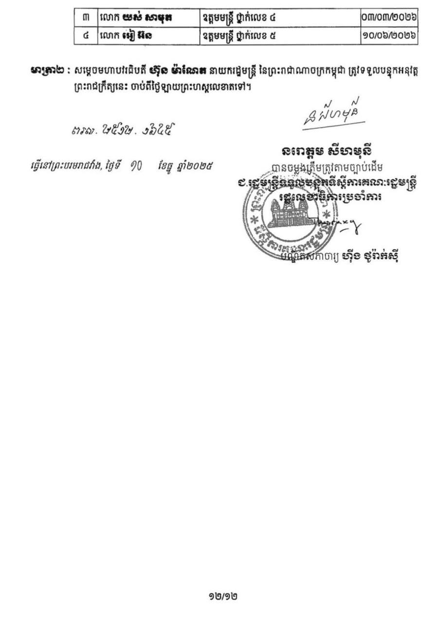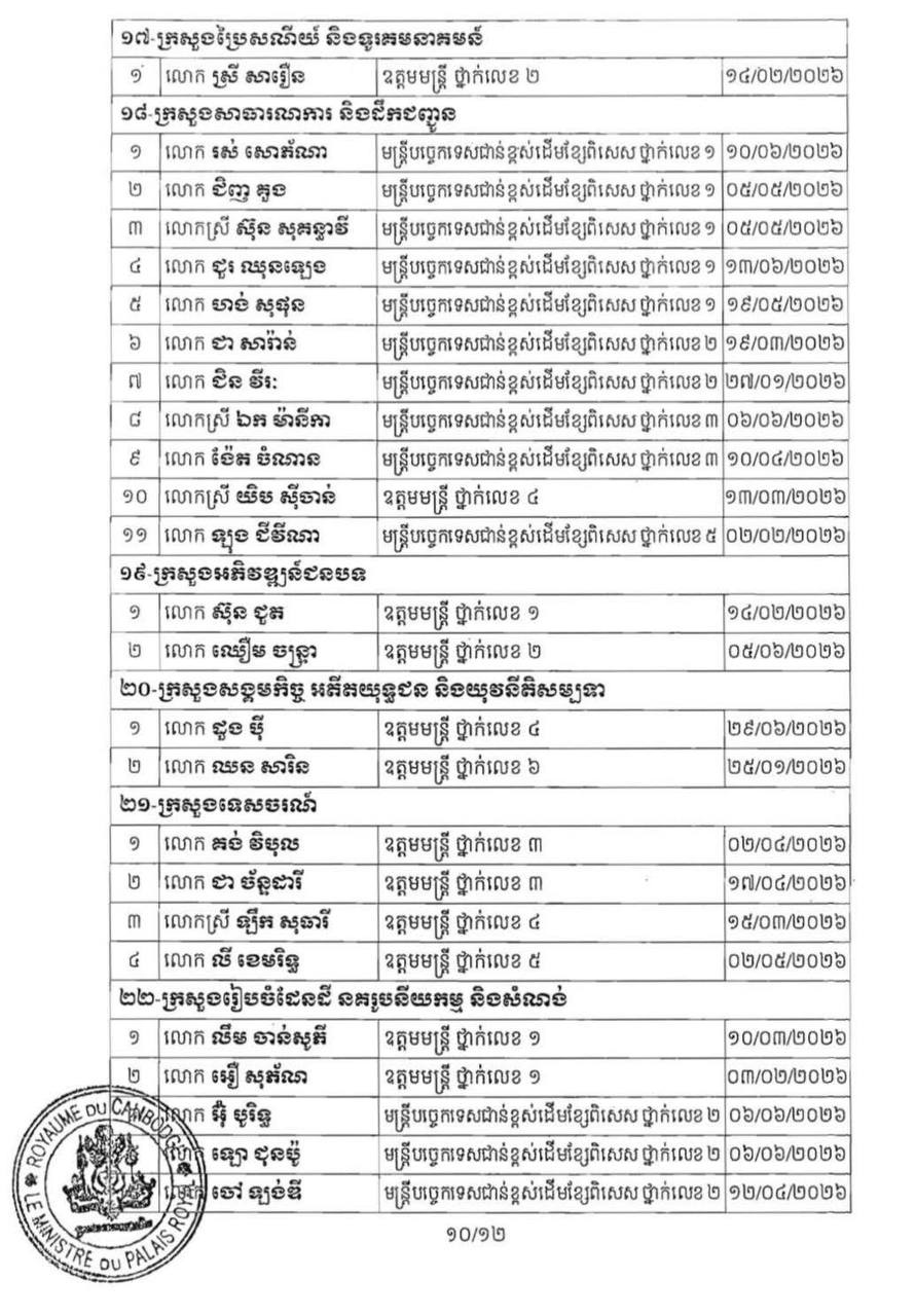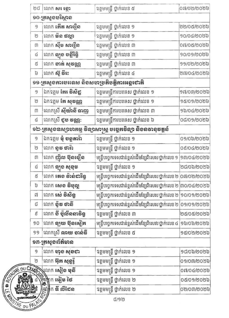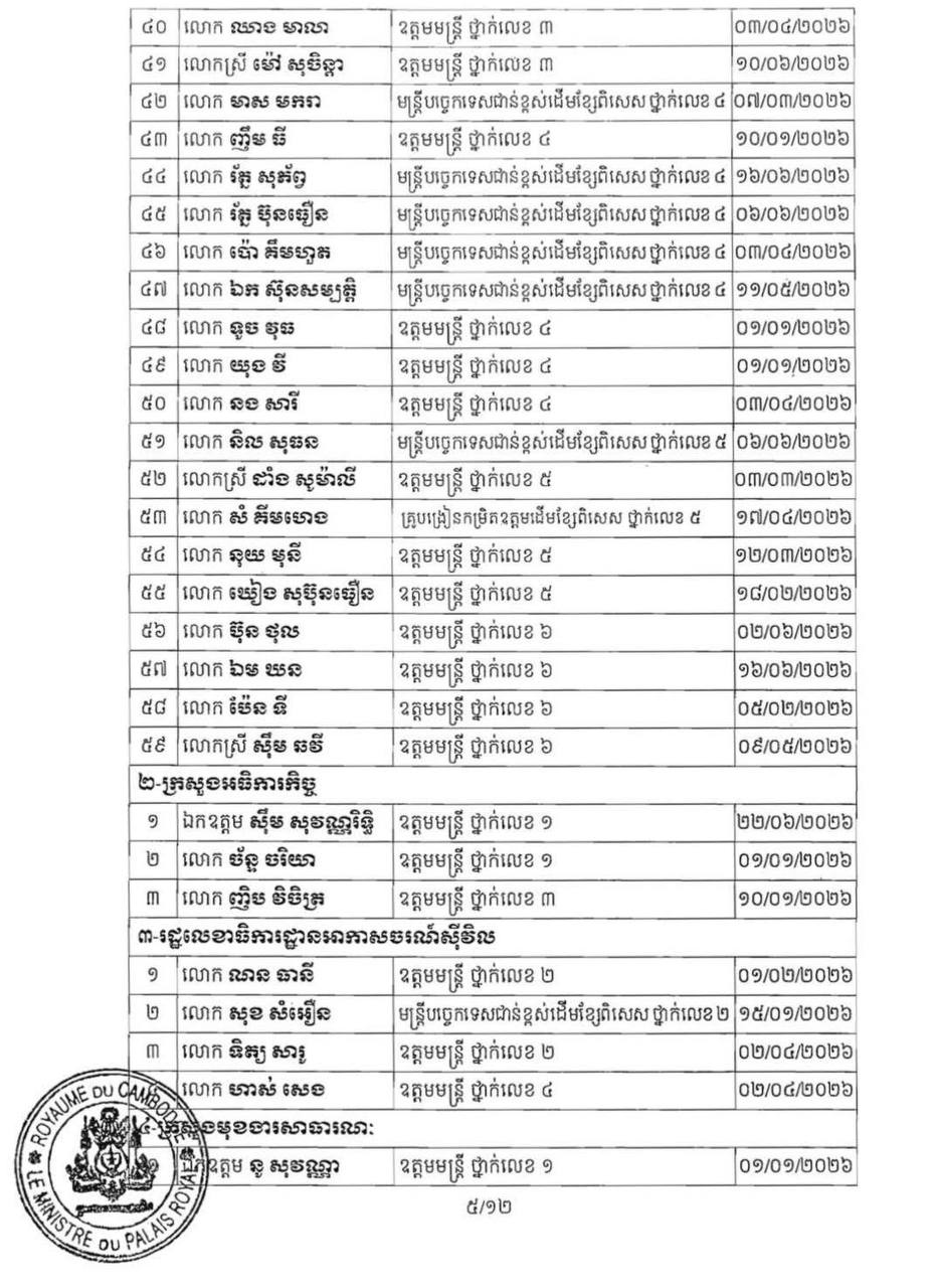 (ភ្នំពេញ)៖ ព្រះករុណា ព្រះបាទសម្ដេច ព្រះមរបនាថ នរោត្តម សីហមុនី ព្រះមហាក្សត្រនៃកម្ពុជា បានចេញព្រះរាជក្រឹត្យត្រាស់បង្គាប់ដាក់ឲ្យមន្ដ្រីរាជការ ចំនួន២៣០នាក់ របស់ក្រសួង ស្ថាប័ន ចំនួន២៧ ចូលនិវត្តន៍តាមអាយុកំណត់។ នេះបើតាមព្រះរាជក្រឹត្យដែលបណ្ដាញព័ត៌មាន ទទួលបាននៅព្រឹកថ្ងៃទី២៨ ខែមករា ឆ្នាំ២០២៦។