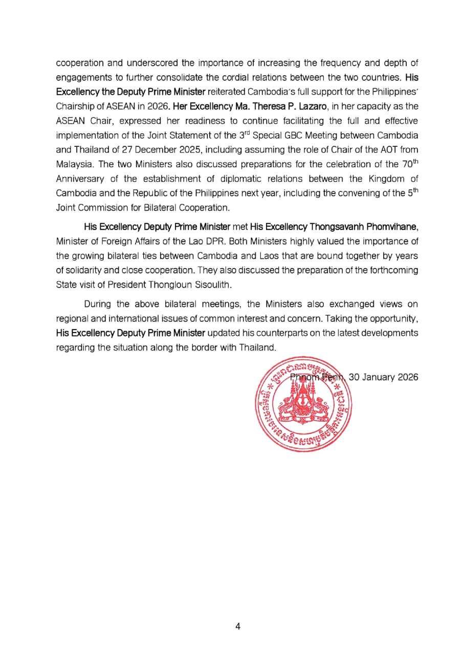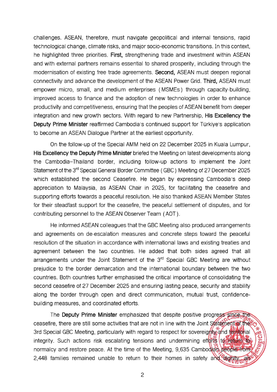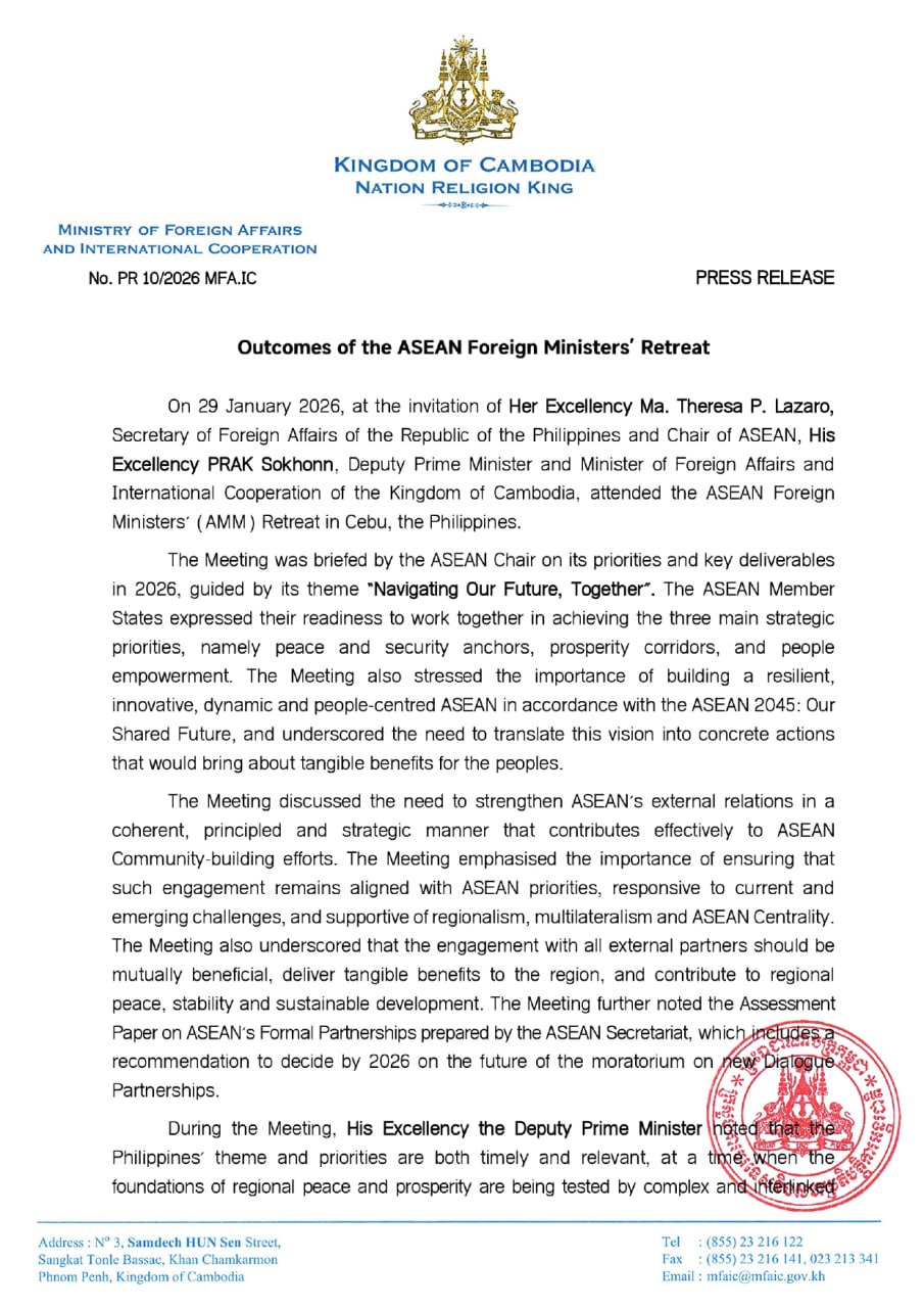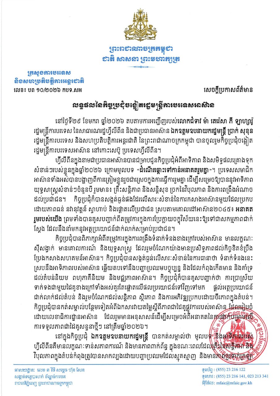 ក្រសួងការបរទេស និងសហប្រតិបត្តិការអន្តរជាតិនៃព្រះរាជាណាចក្រកម្ពុជា នៅថ្ងៃទី៣០ ខែមករា ឆ្នាំ២០២៦ បានបង្ហាញលទ្ធផលកិច្ចប្រជុំចង្អៀតរដ្ឋមន្ត្រីការបរទេសអាស៊ាន។