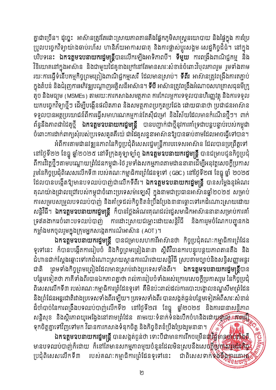 កិច្ចប្រជុំក៏បានសង្កត់ធ្ងន់ផងដែរលើសារៈសំខាន់នៃការកសាងអាស៊ានមួយដែលប្រកប ដោយភាពធន់ នវានុវត្តន៍ ស្វាហាប់ និងផ្តោតលើប្រជាជន ស្របតាមគោលដៅអាស៊ាន២០៤៥៖ អនាគត រួមរបស់យើង ព្រមទាំងបានគូសបញ្ជាក់ពីតម្រូវការក្នុងការប្រែក្លាយចក្ខុវិស័យនេះឱ្យទៅជាសកម្មភាពជាក់ ស្តែង ដែលនឹងនាំមកនូវអត្ថប្រយោជន៍ជាក់លាក់សម្រាប់ប្រជាជន៕