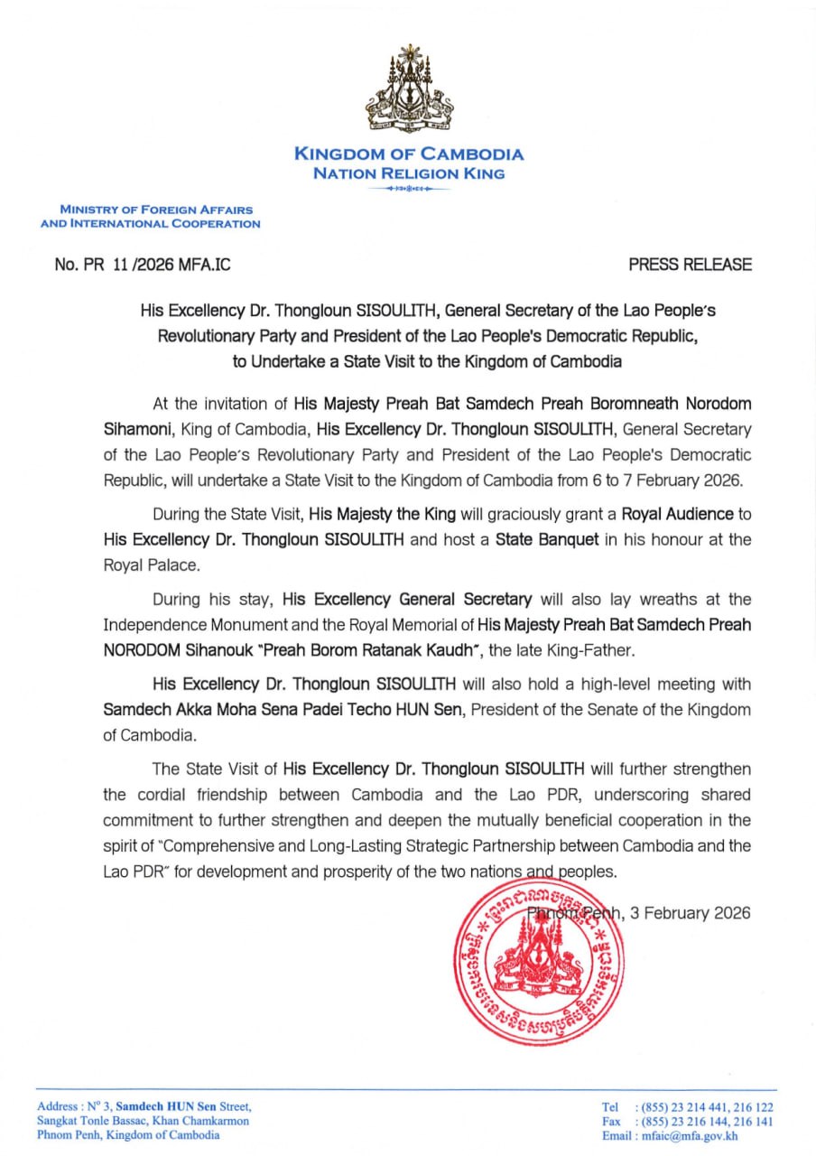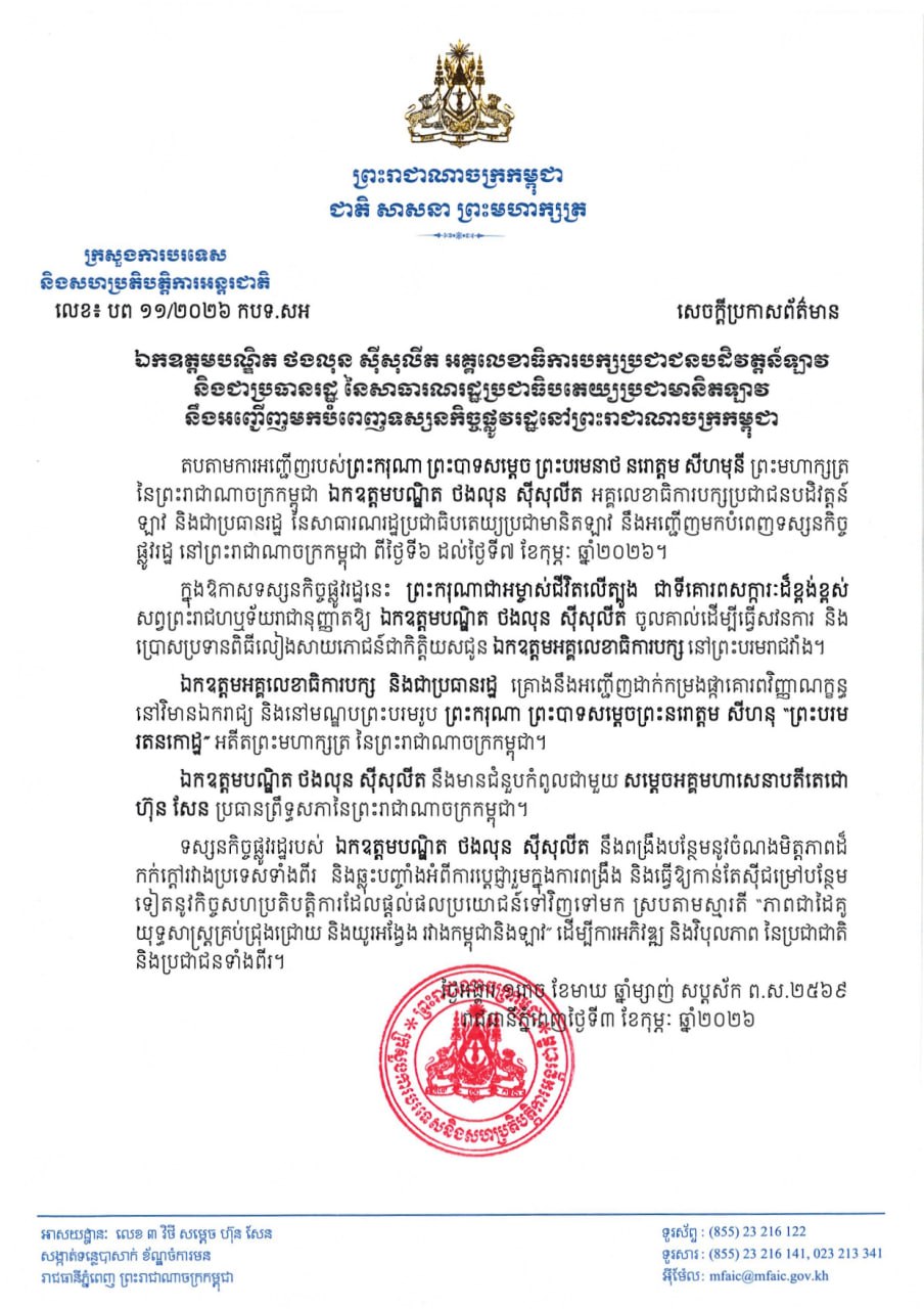 តបតាមការអញ្ជើញរបស់ ព្រះករុណា ព្រះបាទសម្តេច ព្រះបរមនាថ នរោត្តម សីហមុនី ព្រះមហាក្សត្រនៃព្រះរាជាណាចក្រកម្ពុជា លោកបណ្ឌិត ថងលុន ស៊ីសុលីត អគ្គលេខាធិការបក្សប្រជាជនបដិវត្តន៍ឡាវ និងជាប្រធានរដ្ឋនៃសាធារណរដ្ឋប្រជាធិបតេយ្យប្រជាមានិតឡាវ នឹងអញ្ជើញមកបំពេញទស្សនកិច្ចផ្លូវរដ្ឋ នៅកម្ពុជា ពីថ្ងៃទី៦ ដល់ថ្ងៃទី៧ ខែកុម្ភៈ ឆ្នាំ២០២៦។ នេះបើតាមការប្រកាសរបស់ក្រសួងការបរទេស។