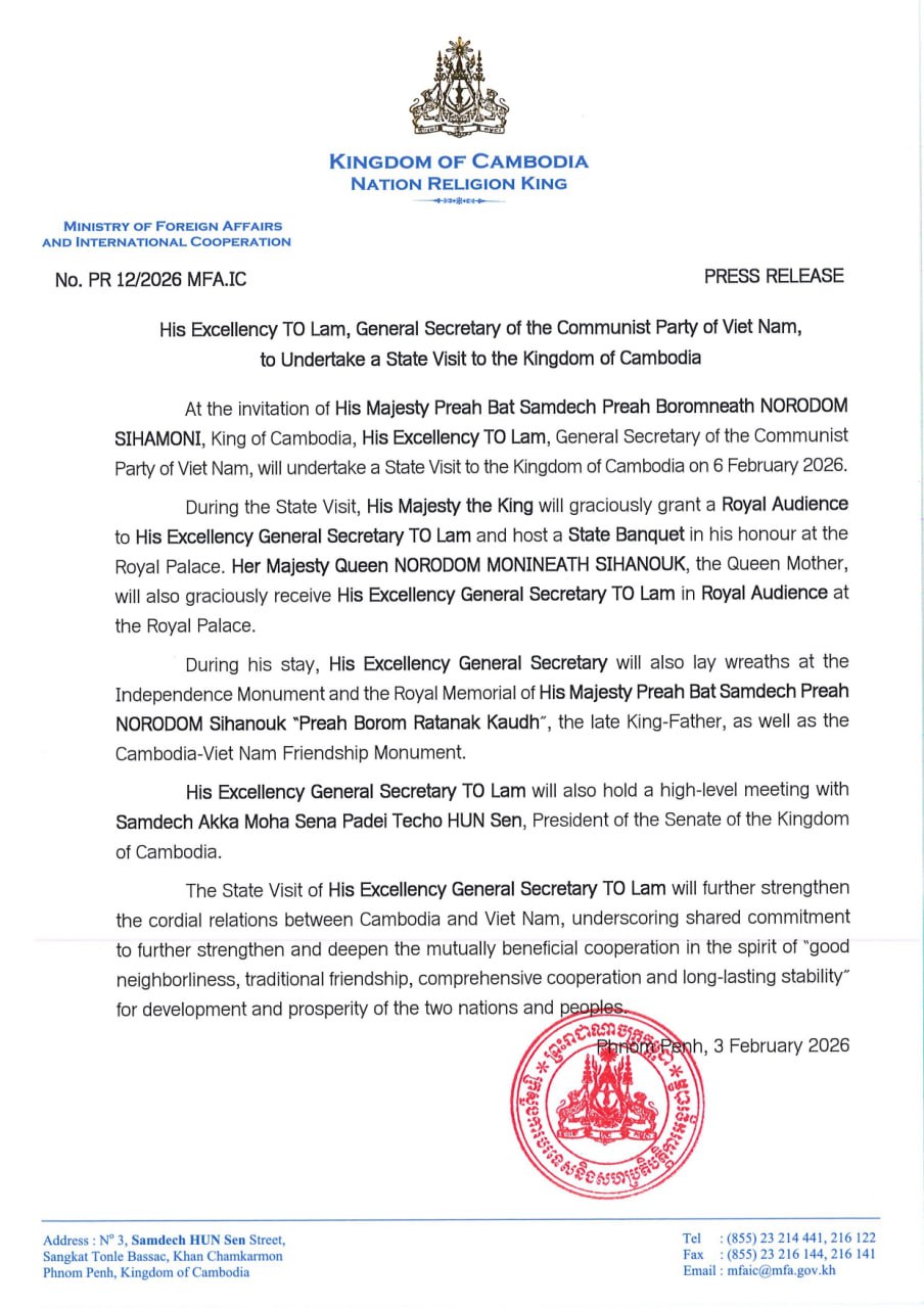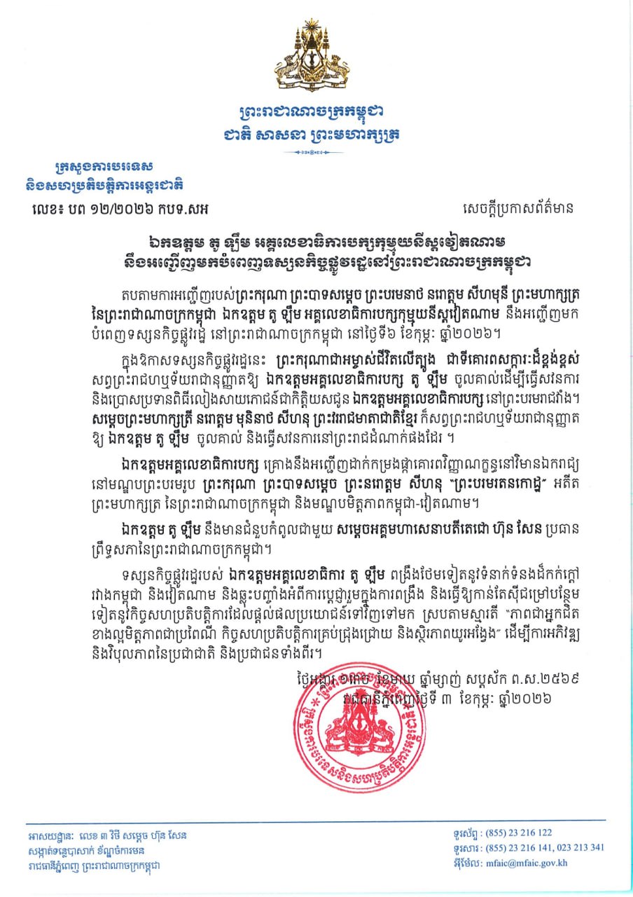 តបតាមការអញ្ជើញរបស់ព្រះករុណា ព្រះបាទសម្តេច ព្រះបរមនាថ នរោត្តម សីហមុនី ព្រះមហាក្សត្រ នៃព្រះរាជាណាចក្រកម្ពុជា លោក តូ ឡឹម អគ្គលេខាធិការបក្សកុម្មុយនីស្តវៀតណាម នឹងអញ្ជើញមកបំពេញទស្សនកិច្ចផ្លូវរដ្ឋ នៅព្រះរាជាណាចក្រកម្ពុជា នៅថ្ងៃទី៦ ខែកុម្ភៈ ឆ្នាំ២០២៦។