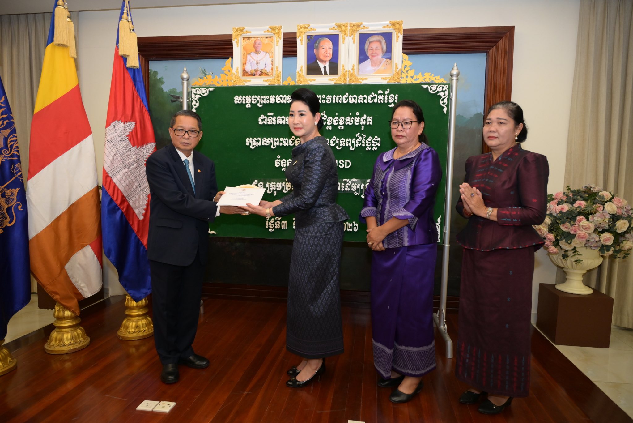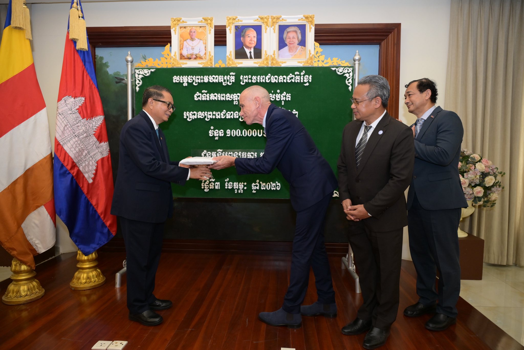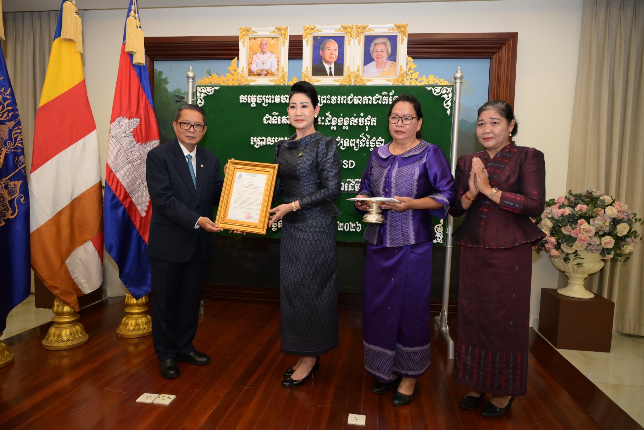 យោងតាមព្រះរាជតម្រិះដ៏ខ្ពង់ខ្ពស់របស់សម្តេចព្រះមហាក្សត្រី ព្រះវររាជមាតាជាតិខ្មែរ ជាទីគោរពសក្ការៈដ៏ខ្ពង់ខ្ពស់បំផុត សម្តេចមហាមន្ត្រី គុយ សុផល ឧបនាយករដ្ឋមន្ត្រី រដ្ឋមន្ត្រីក្រសួងព្រះបរមរាជវាំង ឧត្តមប្រឹក្សាផ្ទាល់ព្រះមហាក្សត្រ និងជាព្រះរាជតំណាងដ៏ខ្ពង់ខ្ពស់សម្តេចព្រះមហាក្សត្រី បានរៀបចំពិធីប្រគល់ព្រះរាជទ្រព្យ ដែលជាព្រះរាជទានដ៏ថ្លៃថ្លារបស់សម្តេចព្រះមហាក្សត្រី ព្រះវររាជមាតាជាតិខ្មែរ ជាទីគោរពសក្ការៈដ៏ខ្ពង់ខ្ពស់បំផុត ជូនដល់មន្ទីរពេទ្យ មជ្ឈមណ្ឌល អង្គការ និងសមាគមចំនួន១១ ដែលប្រព្រឹត្តទៅក្នុងក្រសួងព្រះបរមរាជវាំង នៅរសៀលថ្ងៃទី០៣ ខែកុម្ភៈ ឆ្នាំ២០២៦។