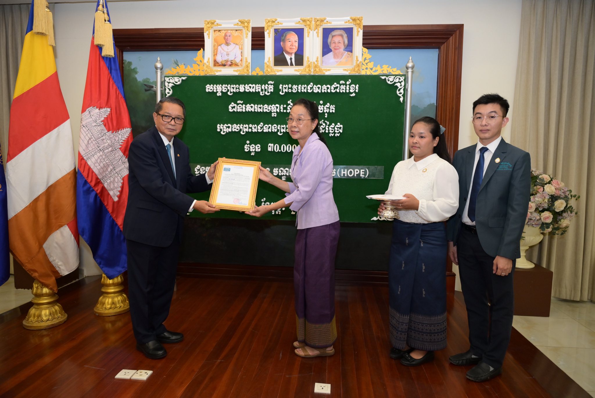 ៥. មន្ទីរពេទ្យព្រះសីហនុមណ្ឌលនៃក្តីសង្ឃឹម រាជធានីភ្នំពេញ ដឹកនាំដោយលោកស្រីវេជ្ជបណ្ឌិត លឹម គ្រុយ តំណាងលោកសាស្ត្រាចារ្យវេជ្ជបណ្ឌិត ចាប សៀកឆាយ នាយកមន្ទីរពេទ្យព្រះសីហនុមណ្ឌលនៃក្តីសង្ឃឹម ទទួលបានព្រះរាជទ្រព្យចំនួន ៣០.០០០$ (សាមសិបពាន់ដុល្លារសហរដ្ឋអាម៉េរិក)
