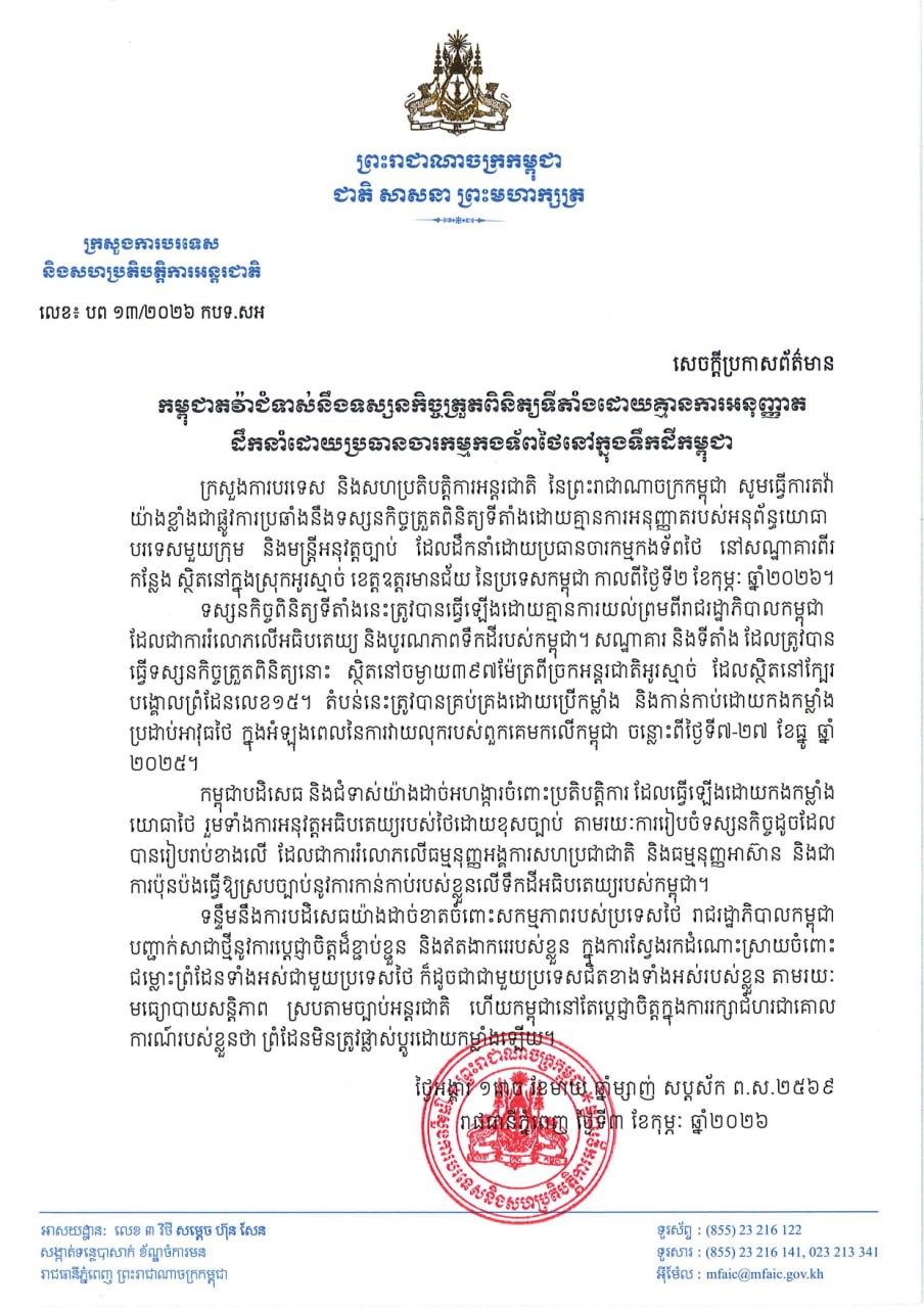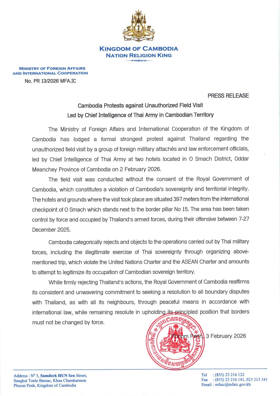 ក្រសួងការបរទេស និងសហប្រតិបត្តិការអន្តរជាតិ នៃព្រះរាជាណាចក្រកម្ពុជា នៅថ្ងៃទី៤ ខែកុម្ភៈ ឆ្នាំ២០២៦ បានចេញលិខិតធ្វើការតវ៉ា យ៉ាងខ្លាំងជាផ្លូវការប្រឆាំងនឹងទស្សនកិច្ចត្រួតពិនិត្យទីតាំង ដោយគ្មានការអនុញ្ញាតរបស់អនុព័ន្ធយោធា បរទេសមួយក្រុម និងមន្ត្រីអនុវត្តច្បាប់ ដែលដឹកនាំដោយប្រធានចារកម្មកងទ័ពថៃ នៅសណ្ឋាគារពីរកន្លែង ស្ថិតនៅក្នុងស្រុកអូរស្មាច់ ខេត្តឧត្តរមានជ័យ នៃប្រទេសកម្ពុជា កាលពីថ្ងៃទី២ ខែកុម្ភៈ ឆ្នាំ២០២៦។