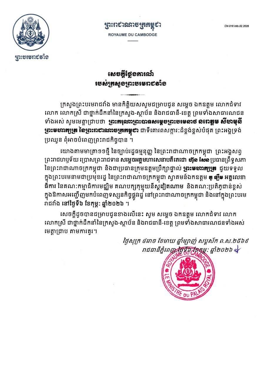 (ភ្នំពេញ)៖ ក្រសួងព្រះបរមរាជវាំង នៅព្រឹកថ្ងៃទី៦ ខែកុម្ភៈ ឆ្នាំ២០២៦នេះ បានចេញសេចក្តីថ្លែងការណ៍ដោយបញ្ជាក់ថា ព្រះមហាក្សត្រកម្ពុជា ព្រះអង្គទ្រង់ប្រឈួន ពុំអាចបំពេញព្រះរាជកិច្ចបាន ប្រគល់ភារកិច្ចជូនសម្តេចតេជោ ហ៊ុន សែន ជាប្រមុខរដ្ឋឱ្យទទួលស្វាគមន៍ឯកឧត្តម តូ ឡឹម អគ្គលេខាធិការគណបក្សកុម្មុយនីស្តវៀតណាម នៅក្នុងព្រះបរមរាជវាំង។