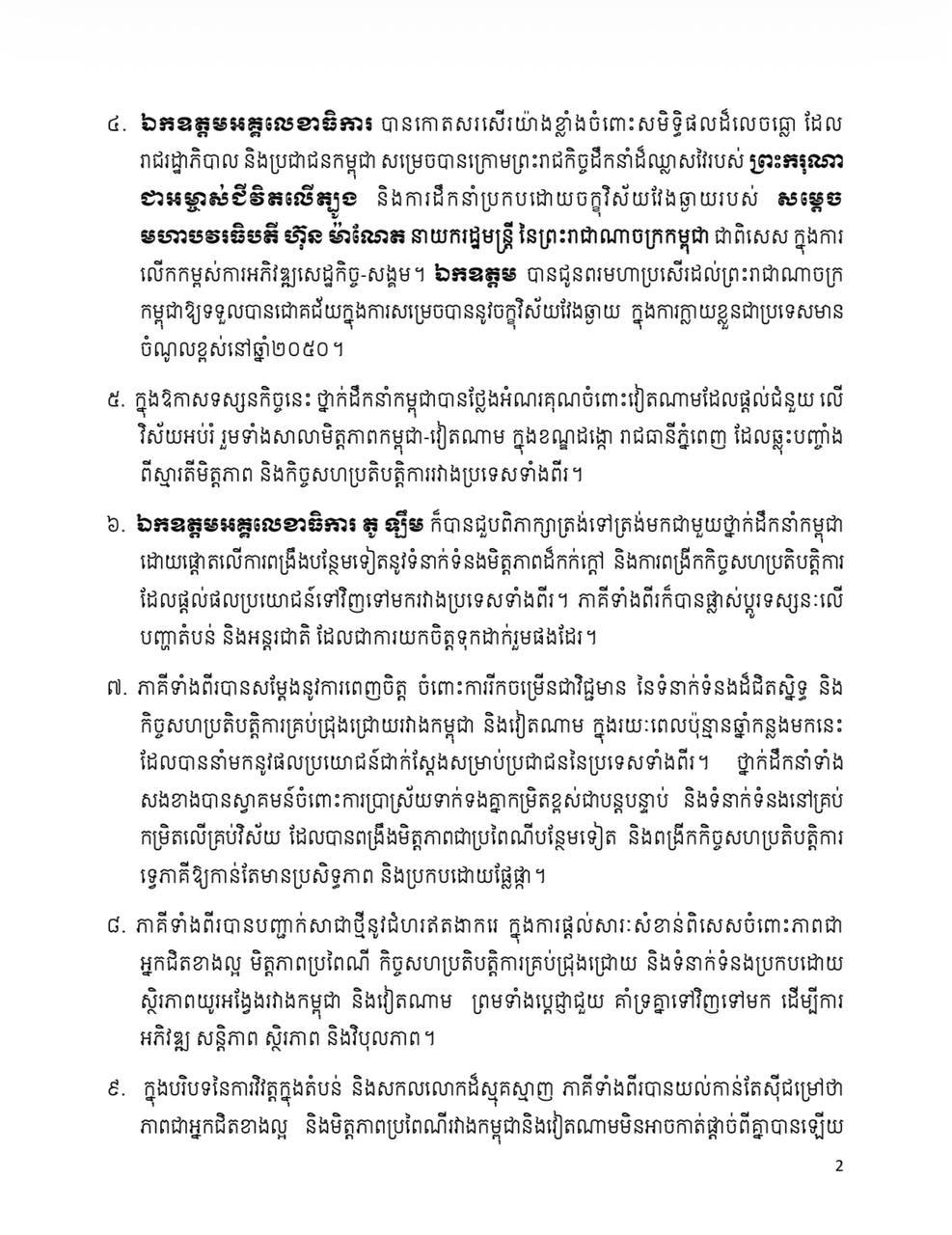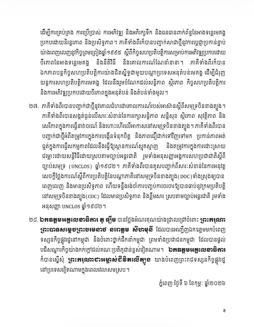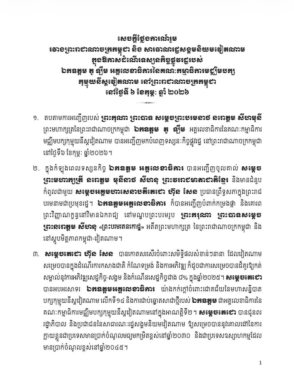 សេចក្តីថ្លែងការណ៍រួម រវាងព្រះរាជាណាចក្រកម្ពុជា និង សាធារណរដ្ឋសង្គមនិយមវៀតណាម ក្នុងឱកាសដំណើរទស្សនកិច្ចផ្លូវរដ្ឋរបស់ ឯកឧត្តម តូ ឡឹម អគ្គលេខាធិការនៃគណៈកម្មាធិការមជ្ឈិមបក្សកុម្មុយនីស្តវៀតណាម នៅព្រះរាជាណាចក្រកម្ពុជា Posted on ថ្ងៃសុក្រ, 6 ខែកុម្ភៈ, 2026ថ្ងៃសុក្រ, 6 ខែកុម្ភៈ, 2026 អត្ថបទដោយ Sovann