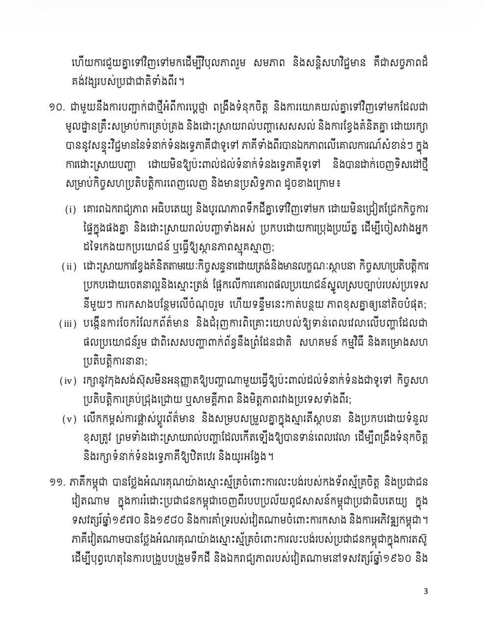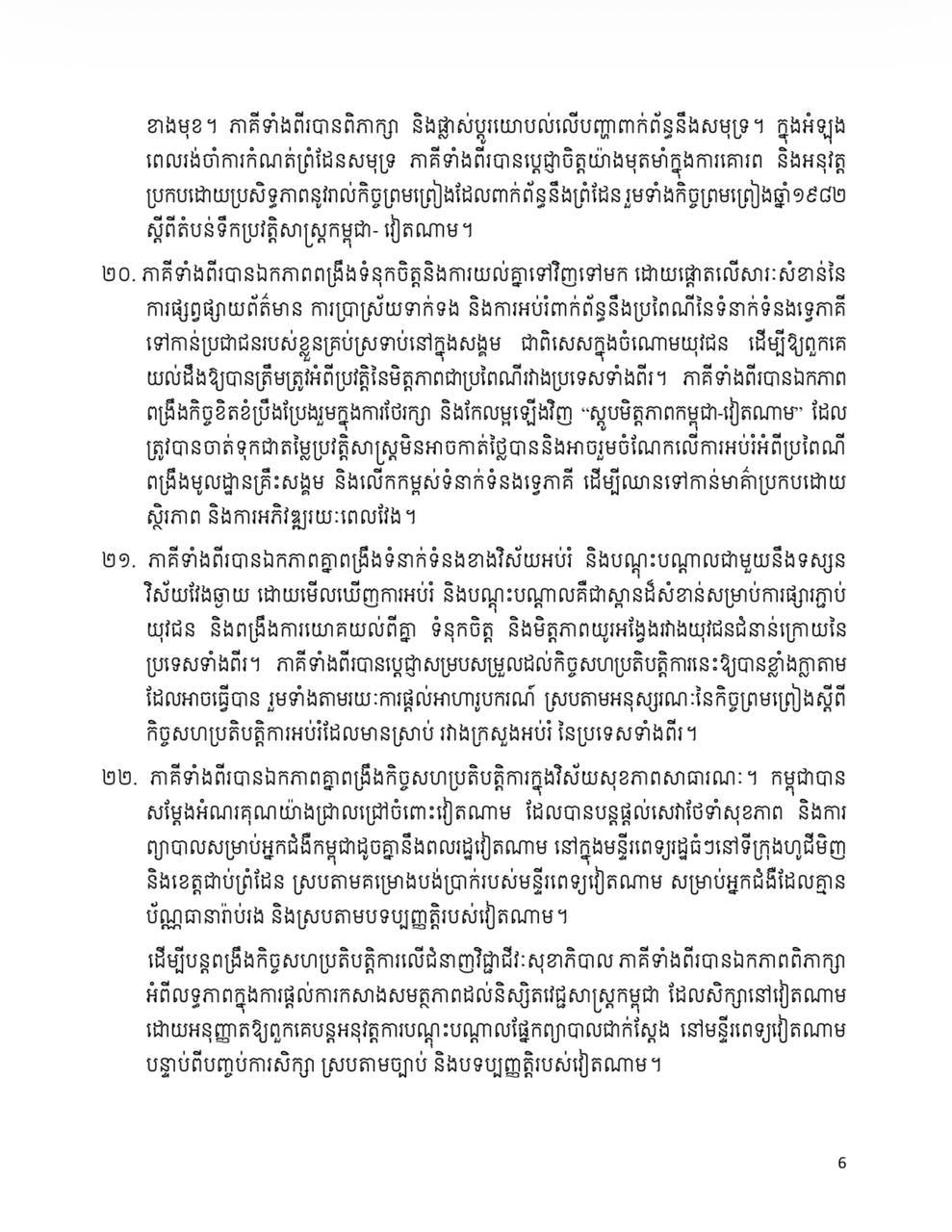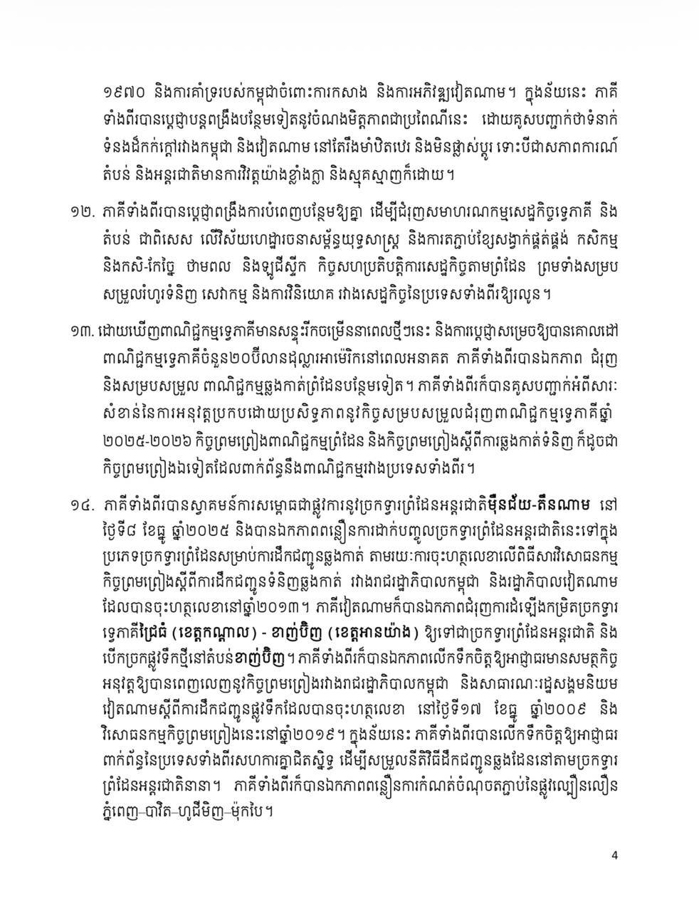 សេចក្តីថ្លែងការណ៍រួម រវាងព្រះរាជាណាចក្រកម្ពុជា និង សាធារណរដ្ឋសង្គមនិយមវៀតណាម ក្នុងឱកាសដំណើរទស្សនកិច្ចផ្លូវរដ្ឋរបស់ ឯកឧត្តម តូ ឡឹម អគ្គលេខាធិការនៃគណៈកម្មាធិការមជ្ឈិមបក្សកុម្មុយនីស្តវៀតណាម នៅព្រះរាជាណាចក្រកម្ពុជា Posted on ថ្ងៃសុក្រ, 6 ខែកុម្ភៈ, 2026ថ្ងៃសុក្រ, 6 ខែកុម្ភៈ, 2026 អត្ថបទដោយ Sovann