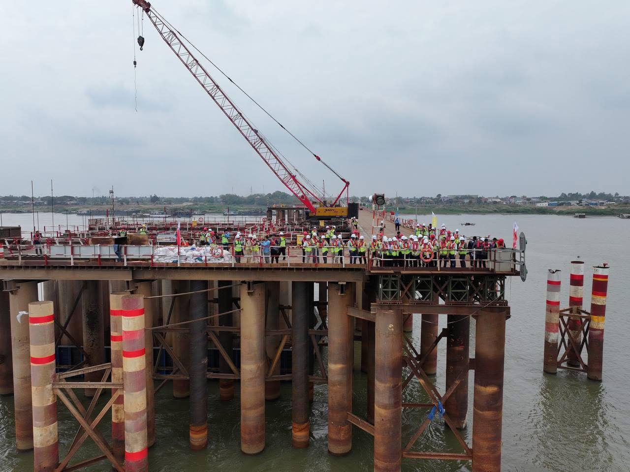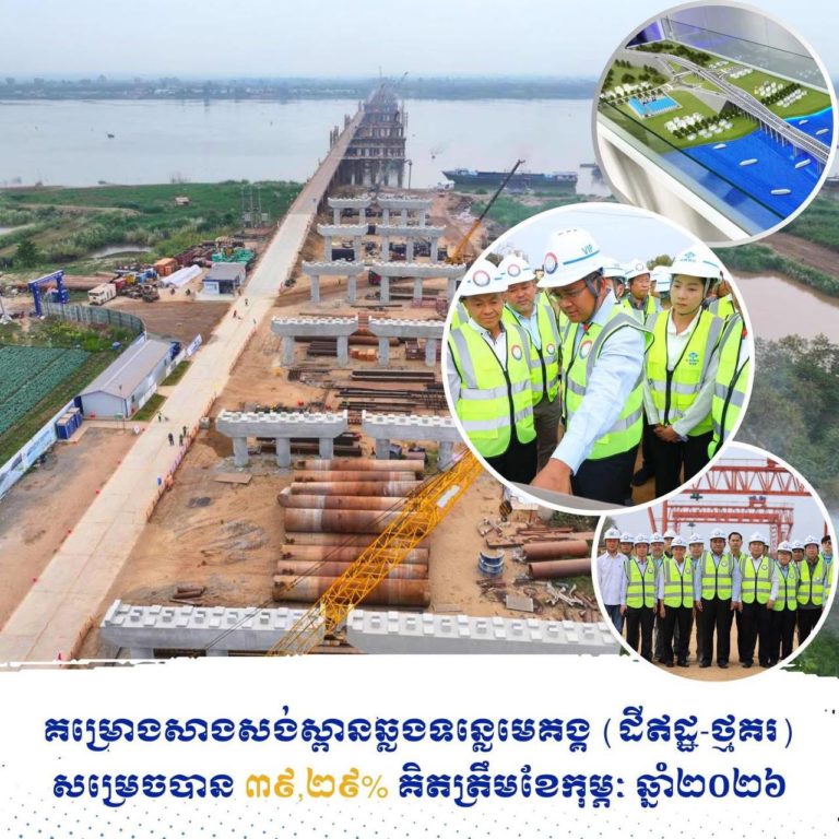 (កណ្តាល)៖ ឯកឧត្តម ប៉េង ពោធិ៍នា រដ្ឋមន្រ្តីក្រសួងសាធារណការ និងដឹកជញ្ជូន នាព្រឹកថ្ងៃទី១១ ខែកុម្ភៈ ឆ្នាំ២០២៦នេះ បានអញ្ជើញដឹកនាំគណៈប្រតិភូ ចុះពិនិត្យវឌ្ឍនភាពការងារគម្រោងសាងសង់ស្ពានឆ្លងទន្លេមេគង្គ (ដីឥដ្ឋ-ថ្មគរ) ដែលស្ថិតនៅឃុំដីឥដ្ឋ ស្រុកកៀនស្វាយ និងឃុំថ្មគរ ស្រុកល្វាឯម ខេត្តកណ្តាល, គម្រោងសាងសង់ស្ពានឆ្លងទន្លេមេគង្គនេះ សម្រេចបាន ៣៩,២៩% គិតត្រឹមខែកុម្ភៈ ឆ្នាំ២០២៦នេះ។