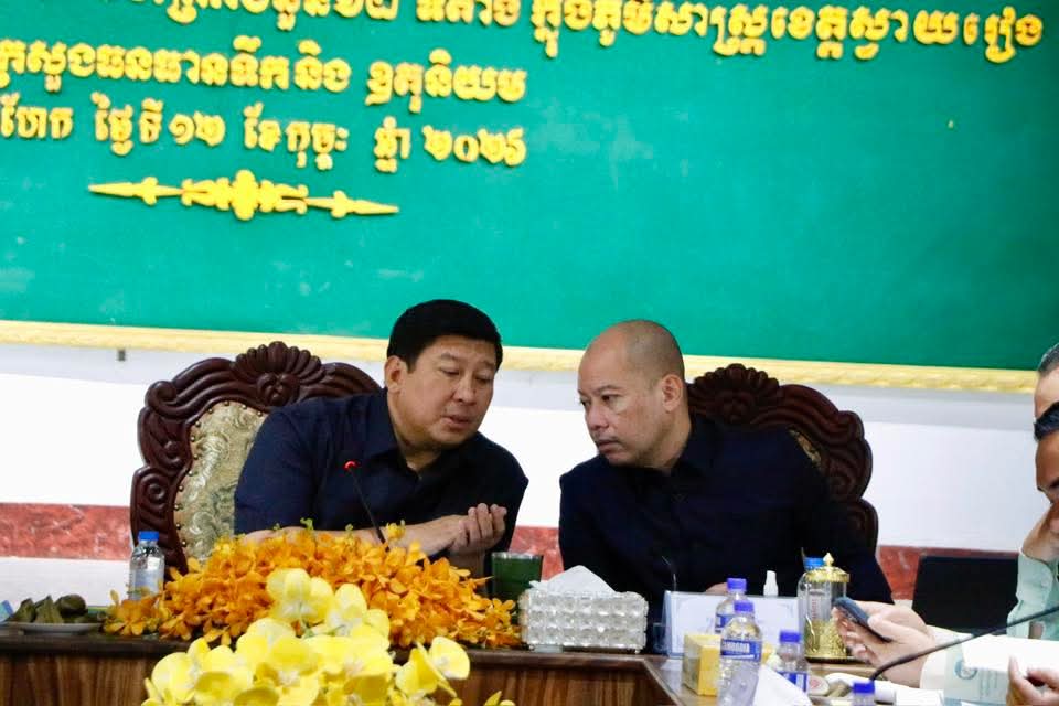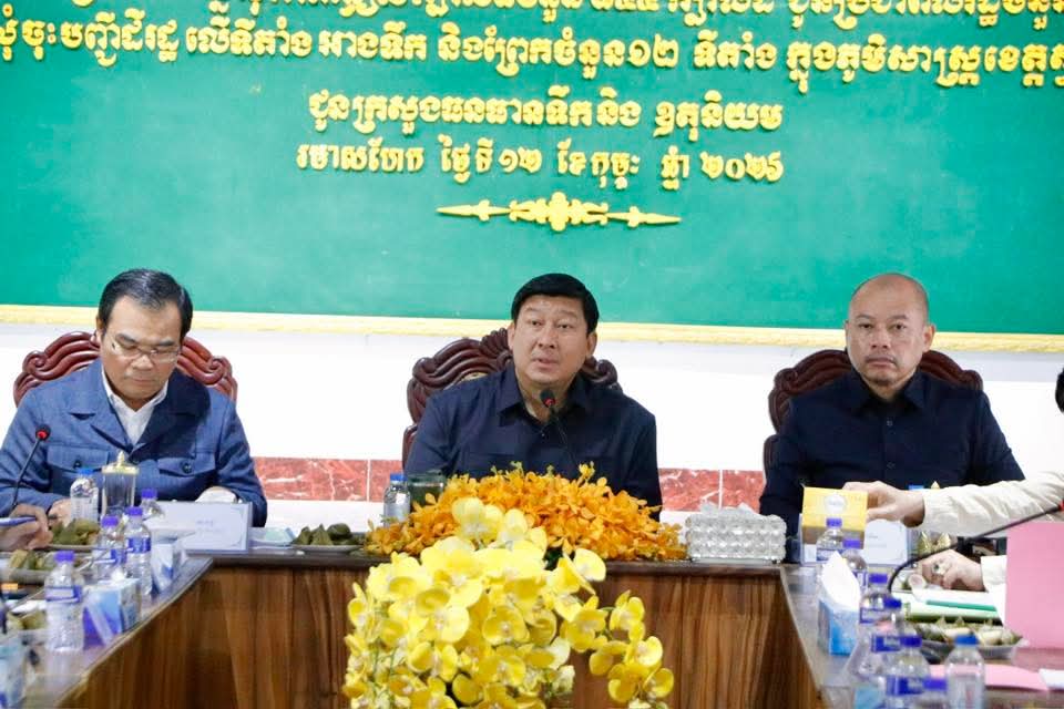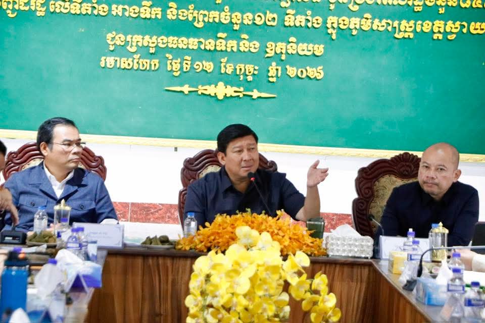 នៅថ្ងៃព្រហស្បតិ៍ ១០រោច ខែមាឃ ឆ្នាំម្សាញ់ សប្តស័ក ពុទ្ធសករាជ ២៥៦៩ ត្រូវនឹងថ្ងៃទី១២ ខែកុម្ភៈ ឆ្នាំ២០២៦នេះ ឯកឧត្តម ថោ ជេដ្ឋា រដ្ឋមន្ត្រីក្រសួងធនធានទឹក និងឧតុនិយម និងឯកឧត្តម ប៉េង ពោធិ៍សា អភិបាល នៃគណៈអភិបាលខេត្តស្វាយរៀងបានអញ្ជេីញចូលរួមជាគណៈអធិបតីក្នុងកិច្ចប្រជុំពិភាក្សាករណីសំណើសុំចុះបញ្ជីដីរដ្ឋលើទីតាំងដីអាងទឹក និងព្រែកចំនួន ១២ទីតាំង ក្នុងភូមិសាស្ត្រខេត្តស្វាយរៀង ក្រោមអធិបតីភាពដ៏ខ្ពង់ខ្ពស់ឯកឧត្តម សាយ សំអាល់ ឧបនាយករដ្ឋមន្ត្រី រដ្ឋមន្ត្រីក្រសួងរៀបចំដែនដី នគរូបនីយកម្ម និងសំណង់។