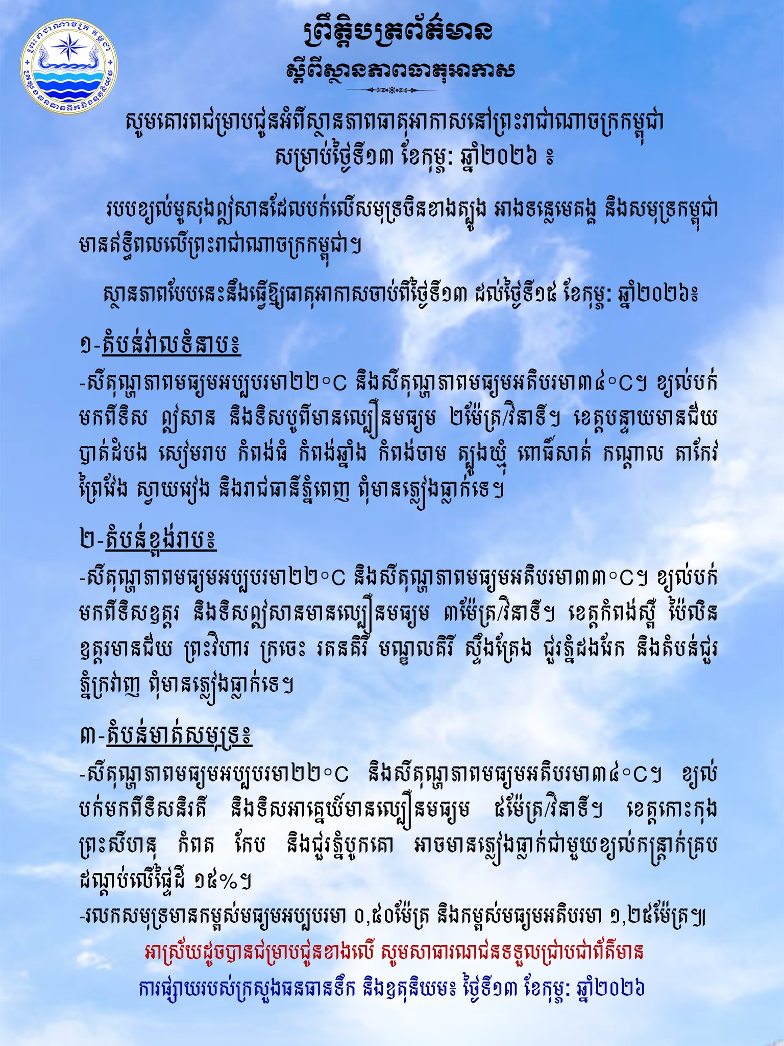 ក្រសួងធនធានទឹក ជូនដំណឹងអំពីស្ថានភាពធាតុអាកាសនៅកម្ពុជា សម្រាប់ថ្ងៃទី១៣ ខែកុម្ភៈ ឆ្នាំ២០២៦