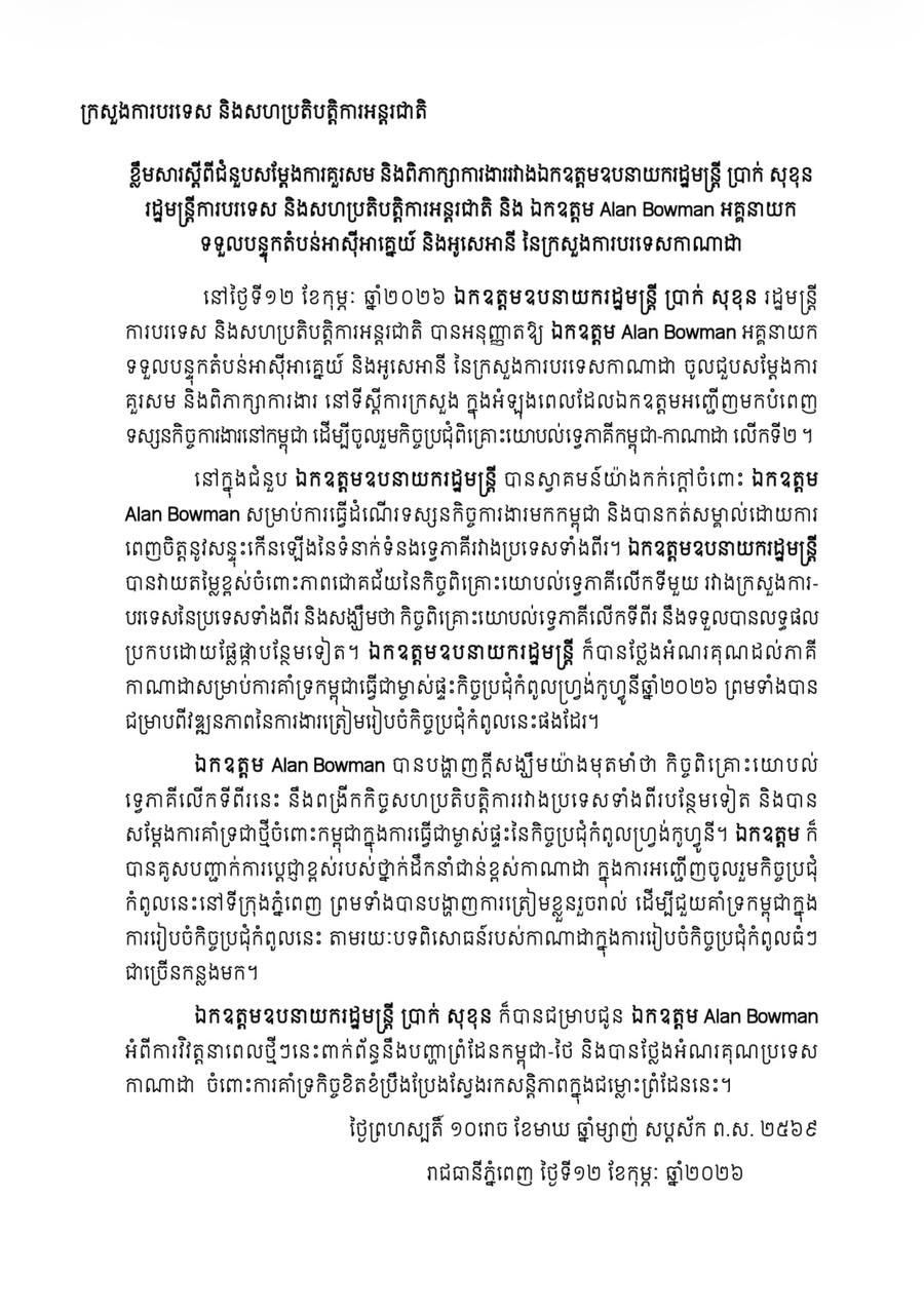 ឧបនាយករដ្ឋមន្ត្រី ប្រាក់ សុខុន ក៏បានជម្រាបជូន លោក Alan Bowman អំពីការវិវត្តនាពេលថ្មីៗនេះពាក់ព័ន្ធនឹងបញ្ហាព្រំដែនកម្ពុជា-ថៃ និងបានថ្លែងអំណរគុណប្រទេស កាណាដា ចំពោះការគាំទ្រកិច្ចខិតខំប្រឹងប្រែងស្វែងរកសន្តិភាពក្នុងជម្លោះព្រំដែននេះ៕
