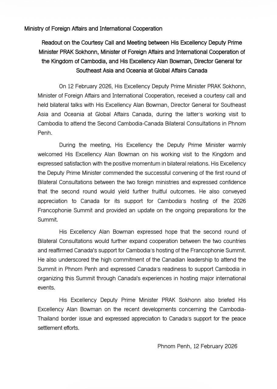 ការបញ្ជាក់របស់លោក បានធ្វើឡើងនាឱកាសដែលលោក ទទួលបានការអនុញ្ញាតពី ឯកឧត្តមឧបនាយករដ្ឋមន្ត្រី ប្រាក់ សុខុន រដ្ឋមន្ត្រីក្រសួងការបរទេស និងសហប្រតិបត្តិការអន្តរជាតិ នៅថ្ងៃទី១២ ខែកុម្ភៈ ឆ្នាំ២០២៦ ចូលជួបសម្តែងការគួរសម និងពិភាក្សាការងារ នៅទីស្តីការក្រសួង។ នេះបើយោងតាមសេចក្ដីប្រកាសព័ត៌មានរបស់ក្រសួងការបរទេស និងសហប្រតិបត្តិការអន្តរជាតិ។