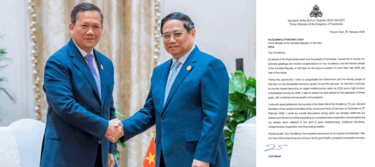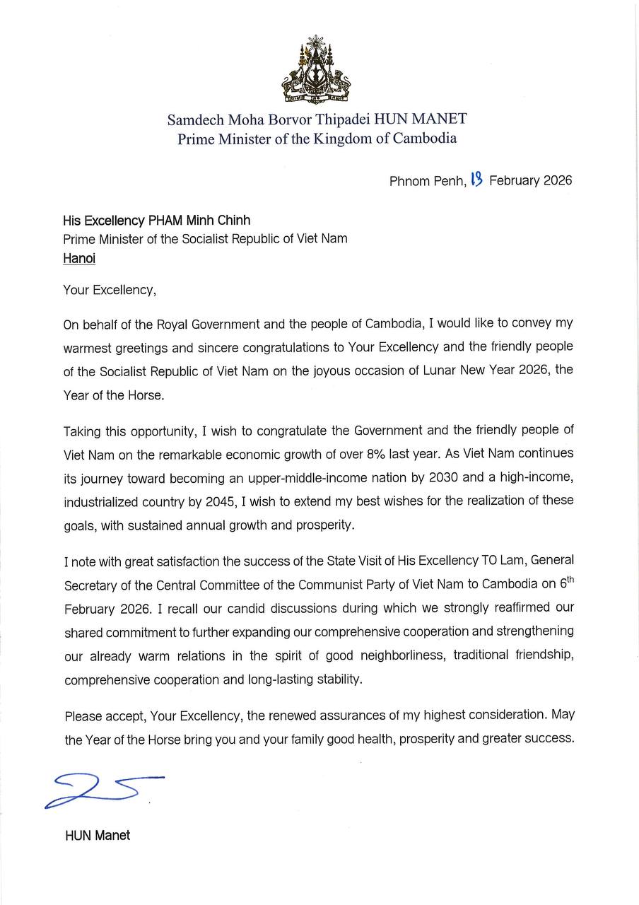 សម្តេចបវរធិបតី ហ៊ុន ម៉ាណែត ផ្ញើសារលិខិតជូនពរឯកឧត្តម ផាម មិញជីញ នាយករដ្ឋមន្ត្រីវៀតណាម ក្នុងឱកាសបុណ្យចូលឆ្នាំថ្មីប្រពៃណីវៀតណាម ឆ្នាំ២០២៦