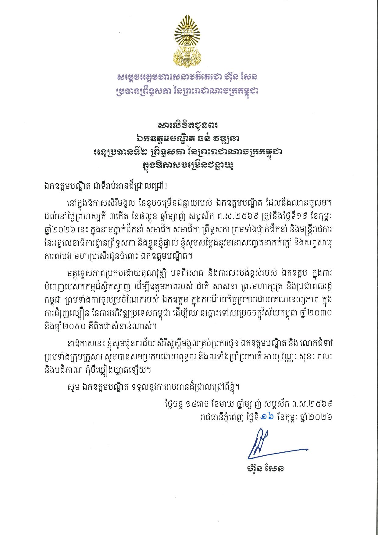 ក្នុងសារលិខិតជូនពរ របស់សម្ដេចតេជោ ហ៊ុន សែន បានសរសេរថា «នៅក្នុងឱកាសសិរីមង្គល នៃខួបចម្រើនជន្មាយុរបស់ ឯកឧត្តមបណ្ឌិត ដែលនឹងឈានចូលមកដល់នៅថ្ងៃព្រហស្បតិ៍ ៣កើត ខែផល្គុន ឆ្នាំម្សាញ់ សប្តស័ក ព.ស.២៥៦៩ ត្រូវនឹងថ្ងៃទី១៩ ខែកុម្ភៈ ឆ្នាំ២០២៦នេះ ក្នុងនាមថ្នាក់ដឹកនាំ សមាជិក សមាជិកា ព្រឹទ្ធសភា ព្រមទាំងថ្នាក់ដឹកនាំ និងមន្ត្រីរាជការ នៃអគ្គលេខាធិការដ្ឋានព្រឹទ្ធសភា និងខ្លួនខ្ញុំផ្ទាល់ ខ្ញុំសូមសម្តែងនូវមនោសញ្ចេតនាកក់ក្តៅ និងសព្ទសាធុ ការពរបវរ មហាប្រសើរជូនចំពោះ ឯកឧត្តមបណ្ឌិត។