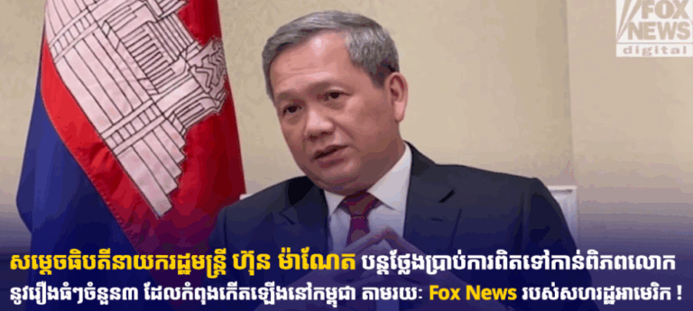 សម្តេចធិបតី ហ៊ុន ម៉ាណែត នាយករដ្ឋមន្រ្តី បានថ្លែងប្រាប់ក្នុងកិច្ចសម្ភាសន៍ផ្ទាល់ជាមួយបណ្តាញព័ត៌មាន Fox News របស់សហរដ្ឋអាមេរិក ជាមួយខ្លឹមសារយ៉ាងដូច្នេះថា៖