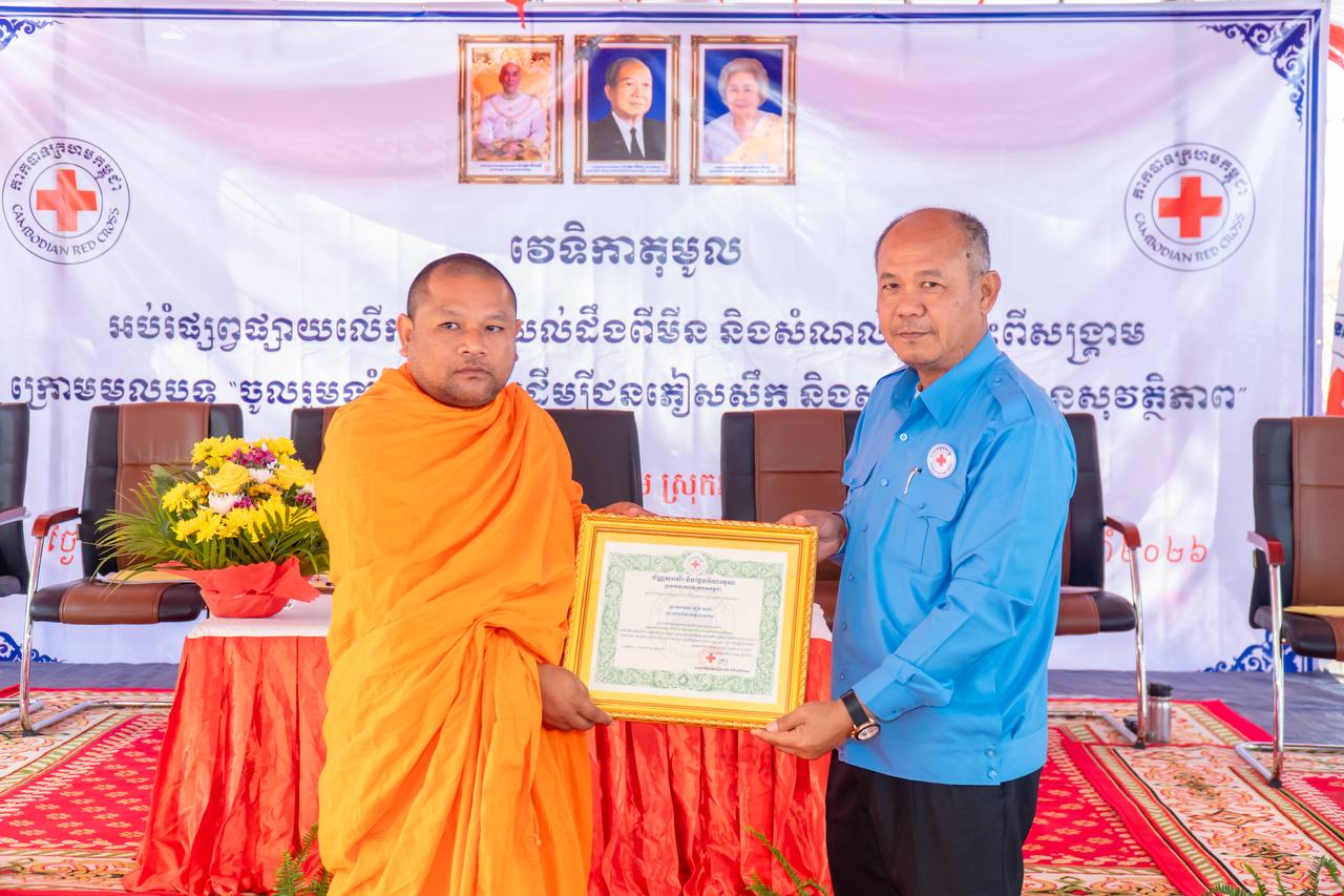 ឯកឧត្តម អ៊ុំ រាត្រី អភិបាលខេត្ត និងជាប្រធានគណៈកម្មាធិការសាខាកាកបាទក្រហមកម្ពុជាខេត្តបន្ទាយមានជ័យ នៅព្រឹកថ្ងៃទី២០ ខែកុម្ភៈ ឆ្នាំ២០២៦ បានអញ្ជើញបើកវេទិកាតុមូល ផ្សព្វផ្សាយលើកកម្ពស់ការ យល់ដឹងពីមីន និងសំណល់ជាតិផ្ទុះពីសង្គ្រាម ក្រោមមូលបទ «ចូលរួមទាំងអស់គ្នា ដើម្បីជនភៀសសឹក និងសហគមន៍មានសុវត្ថិភាព»។ ពិធីនេះបានធ្វើឡើងនៅវត្តចន្ទស៊ី សាមគ្គីរតនារាម ស្ថិតនៅស្រុកអូរជ្រៅ ខេត្តបន្ទាយមានជ័យ។