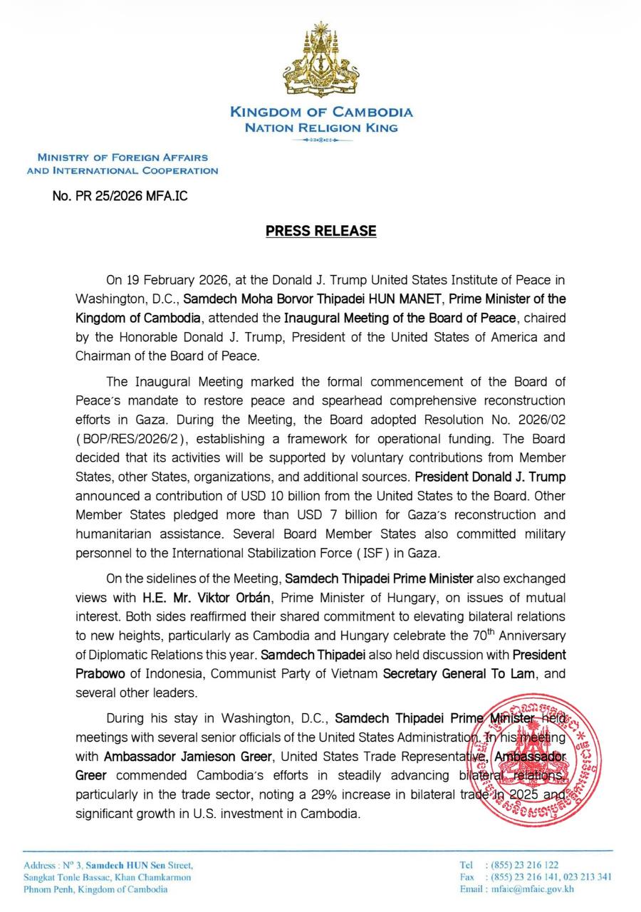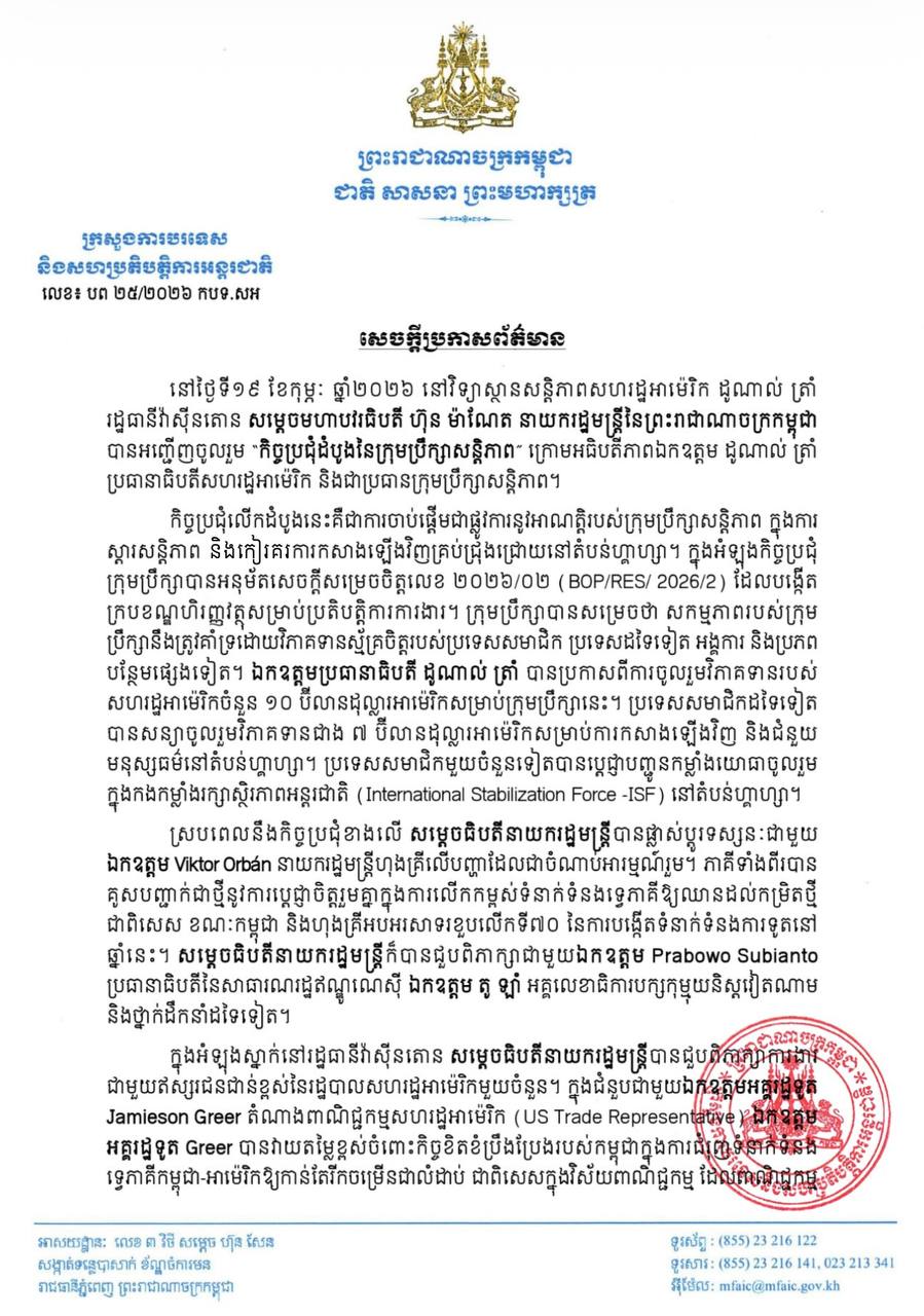 ការពិភាក្សានេះធ្វើឡើងក្នុងឱកាសសម្តេចមហាបវរធិបតី អញ្ជើញស្នាក់នៅរដ្ឋធានីវ៉ាស៊ីនតោន សហរដ្ឋអាម៉េរិក ដើម្បីចូលរួមកិច្ចប្រជុំដំបូងនៃ «ក្រុមប្រឹក្សាសន្តិភាព» និងជួបពិភាក្សាការងារជាមួយថ្នាក់ដឹកនាំ និងឥស្សរជនជាន់ខ្ពស់សហរដ្ឋអាម៉េរិកជាច្រើនរូប។