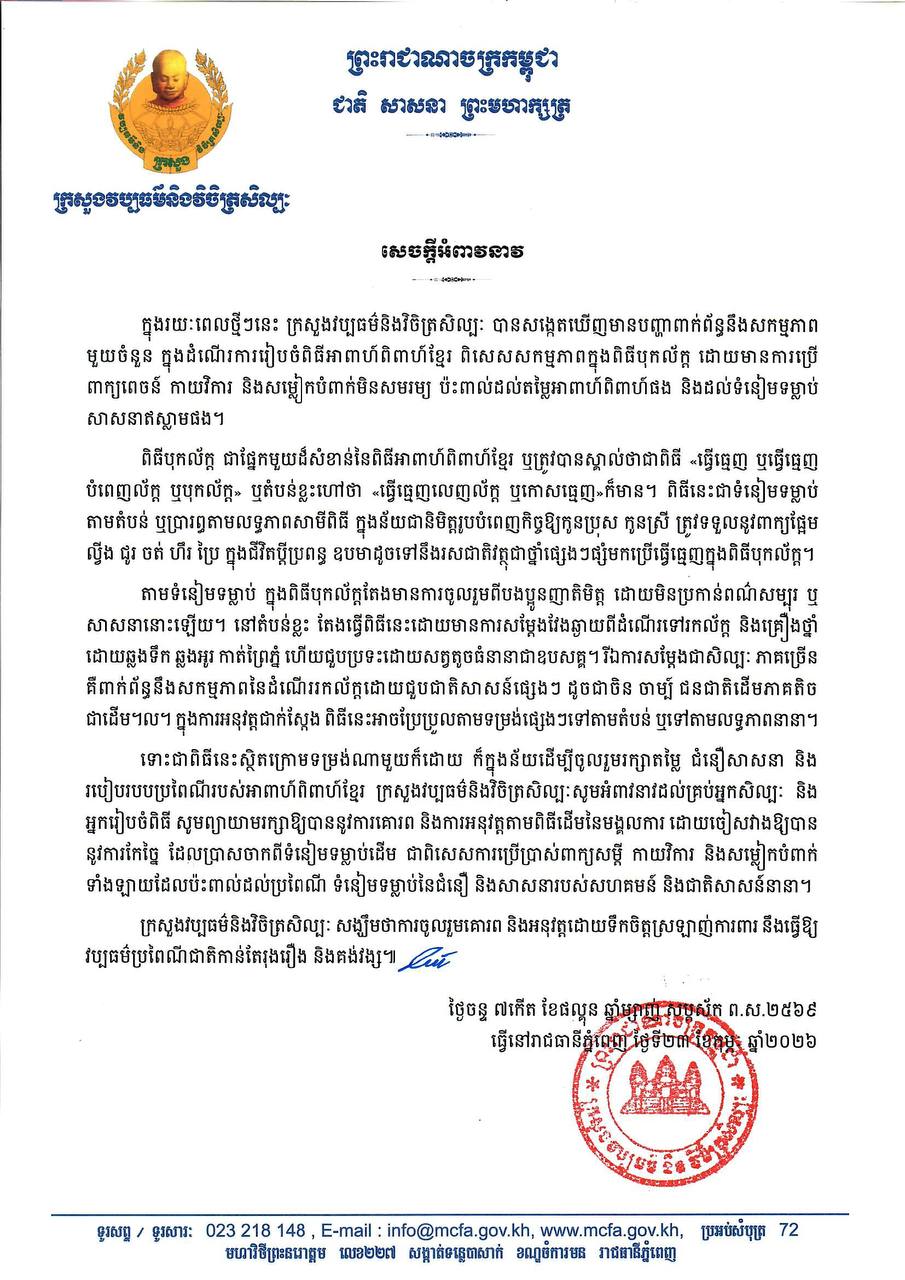 (ភ្នំពេញ)៖ តាមរយៈសេចក្តីអំពាវនាវរបស់ខ្លួន នៅថ្ងៃទី២៣ ខែកុម្ភៈ ឆ្នាំ២០២៦នេះ ក្រសួងវប្បធម៌ និងវិចិត្រសិល្បៈ បានអំពាវនាវដល់គ្រប់អ្នកសិល្បៈ និងអ្នករៀបចំពិធី សូមព្យាយាមរក្សាឱ្យបាននូវការគោរព និងការអនុវត្តតាមពិធីដើមនៃមង្គលការ ដោយចៀសវាងឱ្យបាននូវការកែច្នៃ ដែលប្រាសចាកពីទំនៀមទម្លាប់ដើម ជាពិសេសការប្រើប្រាស់ពាក្យសម្តី កាយវិកា និងសម្លៀកបំពាក់ទាំងឡាយ ដែលប៉ះពាល់ដល់ប្រពៃណី ទំនៀមទម្លាប់នៃជំនឿ និងសាសនារបស់សហគមន៍ និងជាតិសាសន៍នានា។