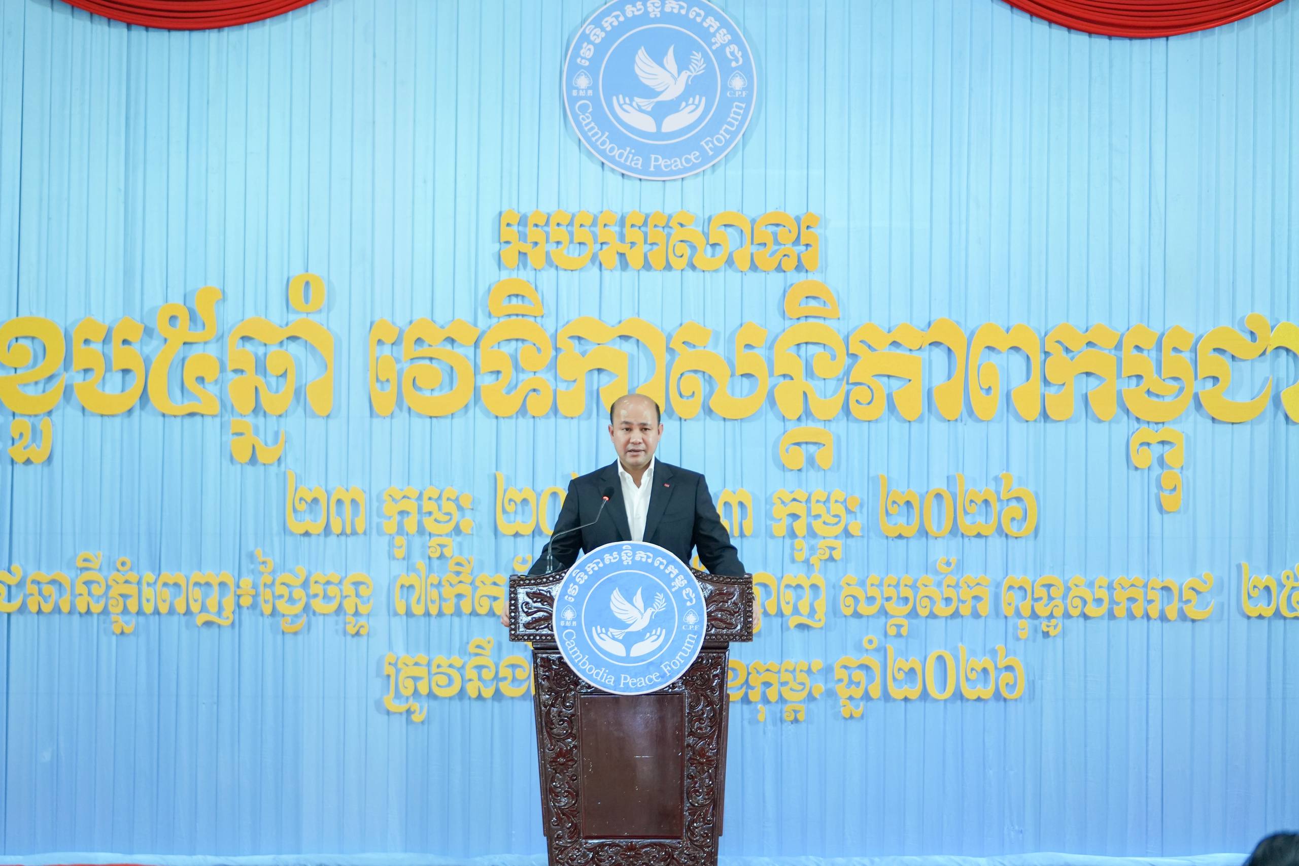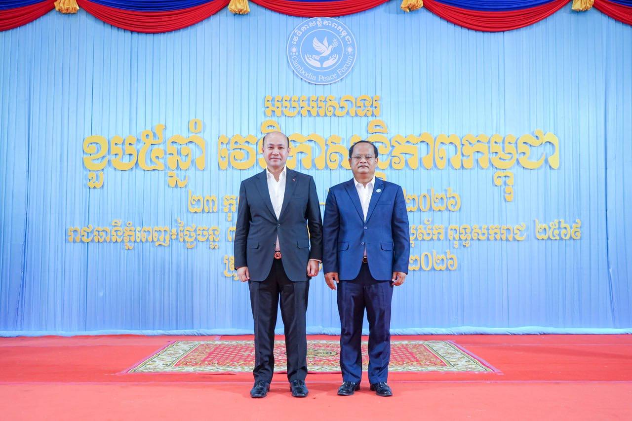(ភ្នំពេញ)៖ នារសៀលថ្ងៃទី២៣ ខែកុម្ភៈ ឆ្នាំ២០២៦ ឯកឧត្តម ហ៊ុន ម៉ានី ឧបនាយករដ្ឋមន្រី្ដ រដ្ឋមន្រី្ដក្រសួងមុខងារសាធារណៈ និងជាប្រធានសហភាពសហព័ន្ធយុវជនកម្ពុជា បានអញ្ជើញជាអធិបតីក្នុងកម្មវិធីខួប៥ឆ្នាំ វេទិកាសន្ដិភាពកម្ពុជា។ ពិធីនេះមានការអញ្ជើញចូលរួមពីសំណាក់ថ្នាក់ដឹកនាំ នៃគណៈអភិបាលរាជធានីភ្នំពេញ ថ្នាក់ដឹកនាំវេទិកាសន្ដិភាពកម្ពុជាថ្នាក់កណ្ដាល ប្រមាណ៣៨០នាក់។