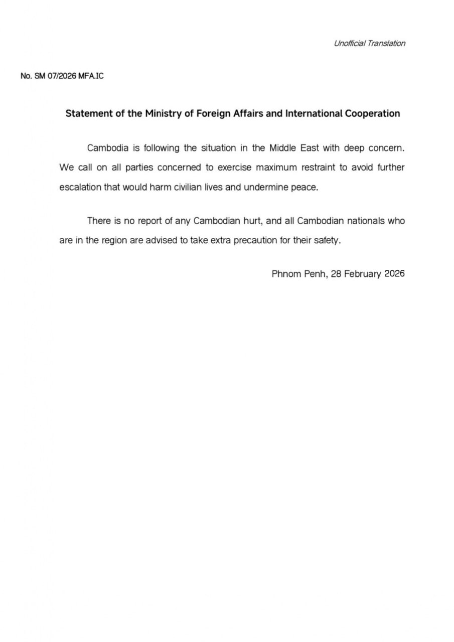 សេចក្តីថ្លែងការណ៍របស់ ក្រសួងការបរទេស និងសហប្រតិបត្តិការអន្តរជាតិ Posted on ថ្ងៃអាទិត្យ, 1 ខែមីនា, 2026ថ្ងៃអាទិត្យ, 1 ខែមីនា, 2026 អត្ថបទដោយ Sovann Statement of the Ministry of Foreign Affairs and International Cooperation