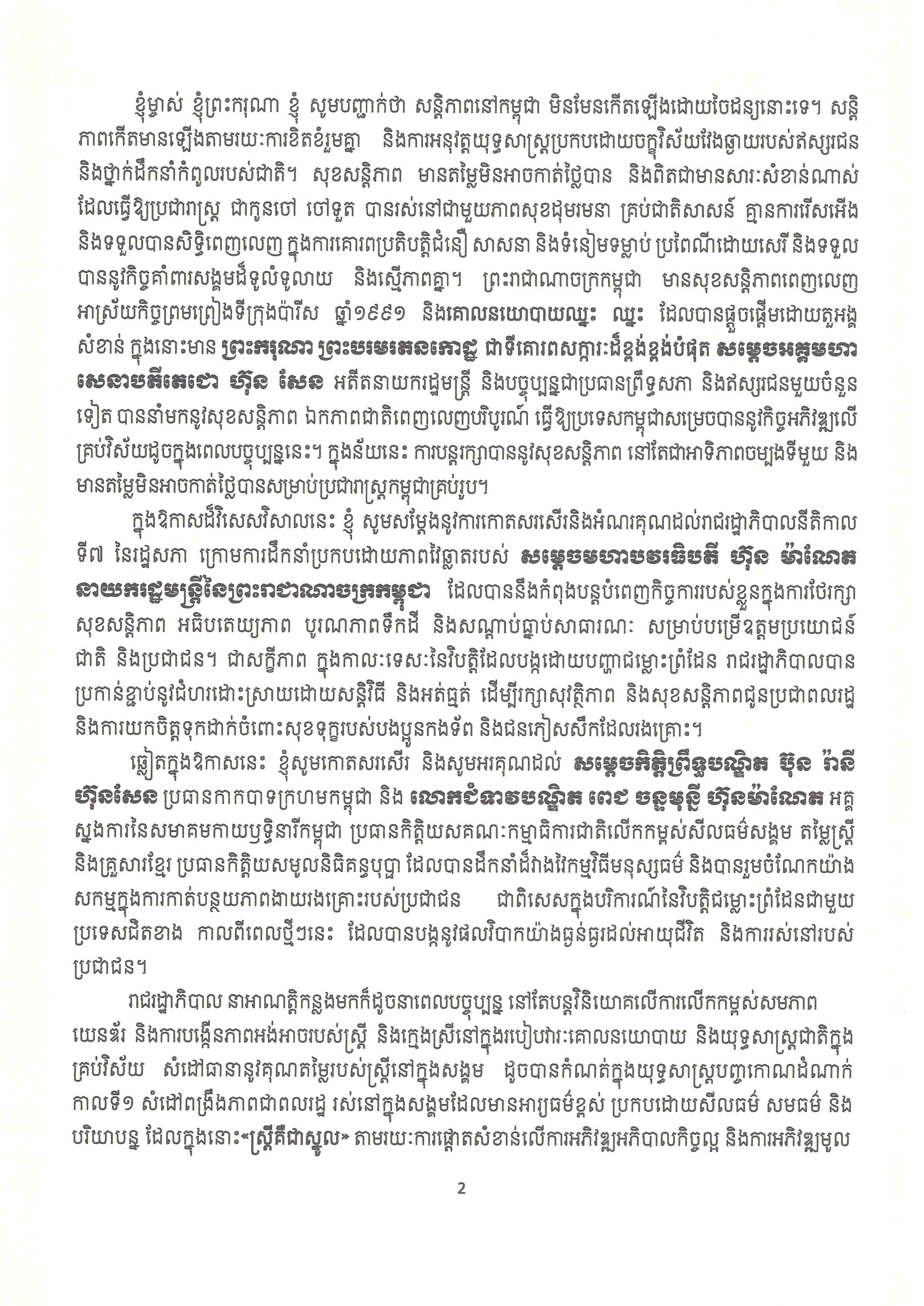 សម្តេចព្រះមហាក្សត្រី នរោត្តម មុនិនាថ សីហនុ ព្រះវររាជមាតាជាតិខ្មែរ បានចេញព្រះរាជសារ ក្នុងឱកាសអបអរសាទរខួបលើកទី១១៥ ទិវាអន្តរជាតិនារី ៨មីនា ឆ្នាំ២០២៦ ក្រោមប្រធានបទ «សន្តិភាព និងសន្តិសុខសម្រាប់ស្ត្រី និងគ្រួសារ»៕