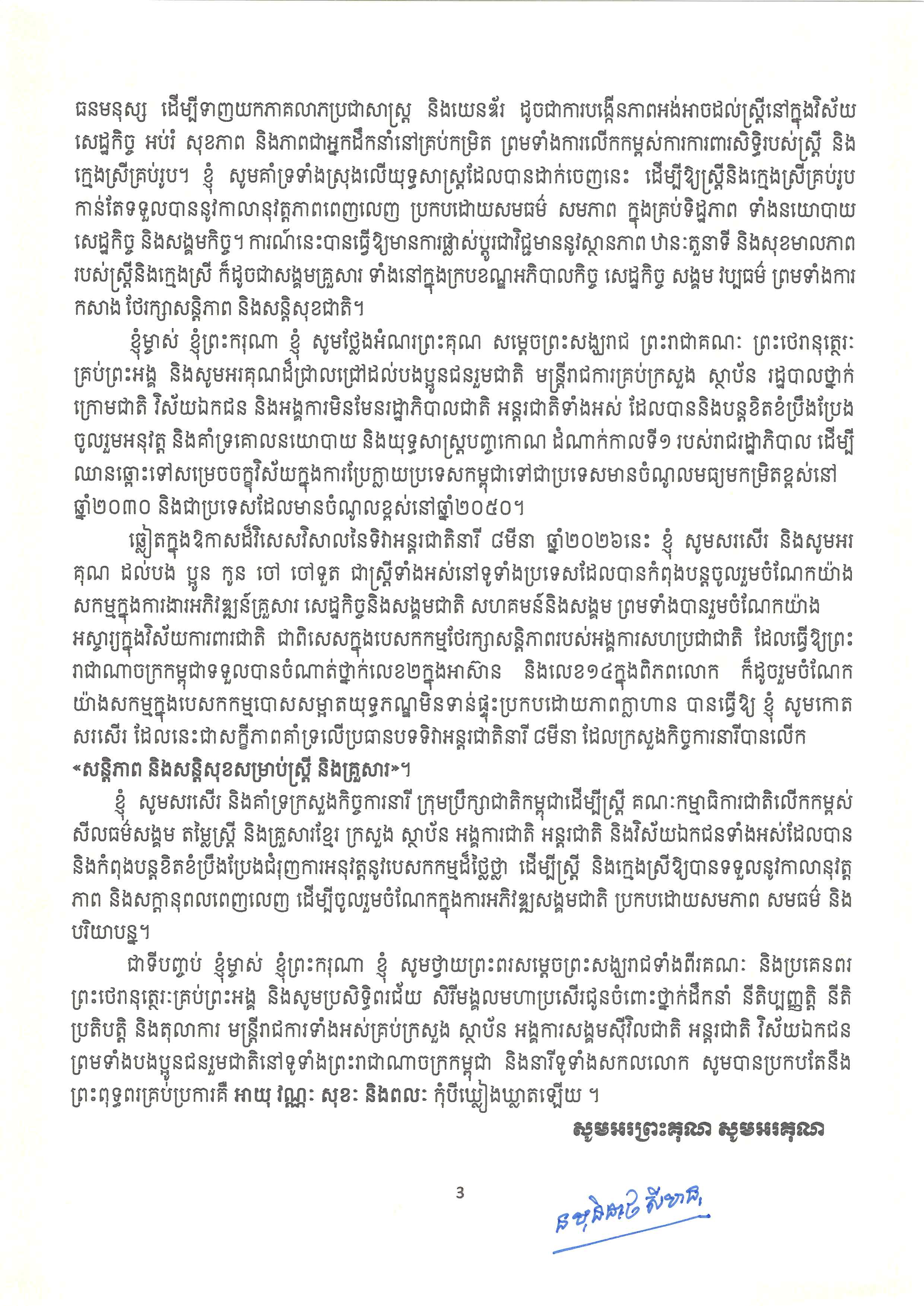 សម្តេចព្រះមហាក្សត្រី ចេញព្រះរាជសារ អបអរសាទរខួបលើកទី១១៥ ទិវាអន្តរជាតិនារី ៨មីនា ឆ្នាំ២០២៦