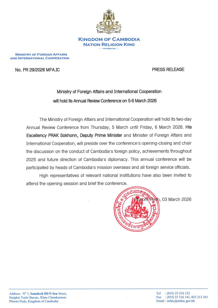 ក្រសួងការបរទេស និងសហប្រតិបត្តិការអន្តរជាតិនឹងរៀបចំសន្និបាត ដើម្បីពិនិត្យសមិទ្ធផលប្រចាំឆ្នាំ ចាប់ពីថ្ងៃទី៥-៦ ខែមីនា ឆ្នាំ២០២៦ ក្រោមអធិបតីភាព ឯកឧត្តមឧបនាយករដ្ឋមន្ត្រី ប្រាក់ សុខុន រដ្ឋមន្ត្រីក្រសួងការបរទេស និងសហប្រតិបត្តិការអន្តរជាតិ។
