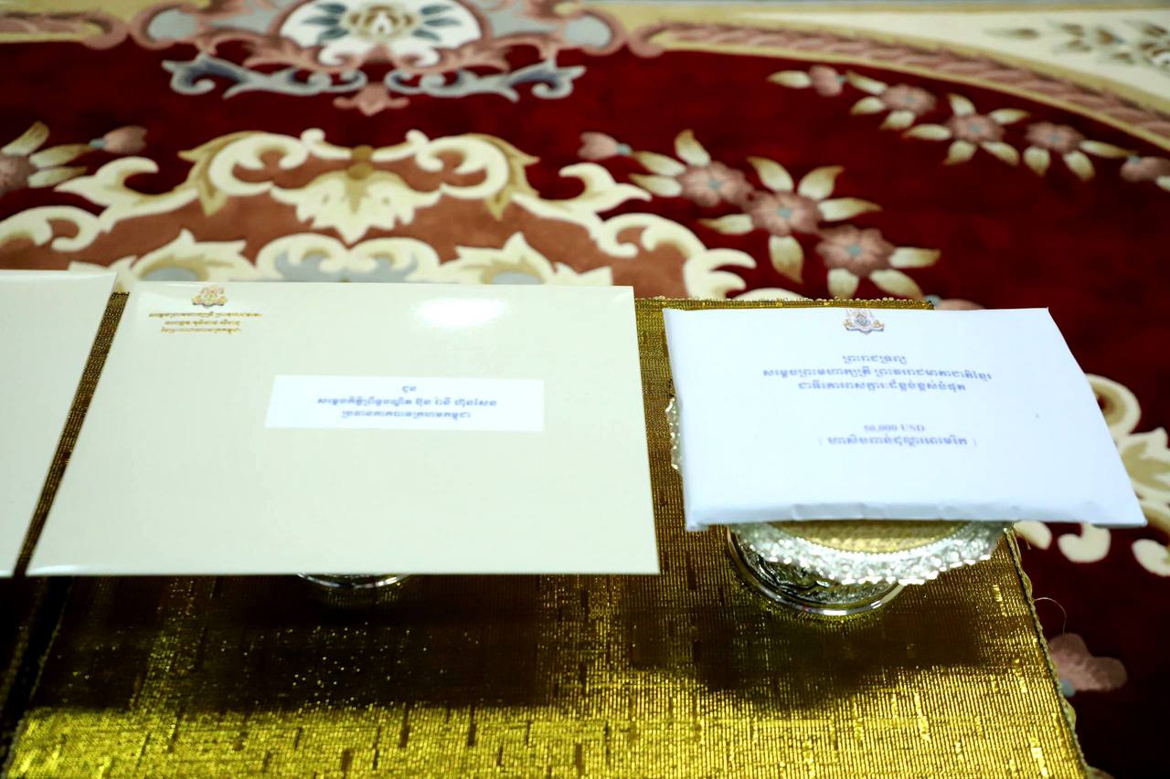 ព្រះរាជសារលិខិត និងព្រះរាជទ្រព្យដ៏ឧត្តុង្គឧត្តមនេះ ត្រូវបានសម្តេចមហាមន្ត្រី គុយ សុផល ឧបនាយករដ្ឋមន្ត្រី រដ្ឋមន្ត្រីក្រសួងព្រះបរមរាជវាំង យកមកប្រគល់ជូនកាកបាទក្រហមកម្ពុជា ដែលតំណាងដោយ លោកជំទាវបណ្ឌិត ពេជ ចន្ទមុន្នី ហ៊ុនម៉ាណែត អនុប្រធានអចិន្ដ្រៃយ៍កាកបាទក្រហមកម្ពុជា ។