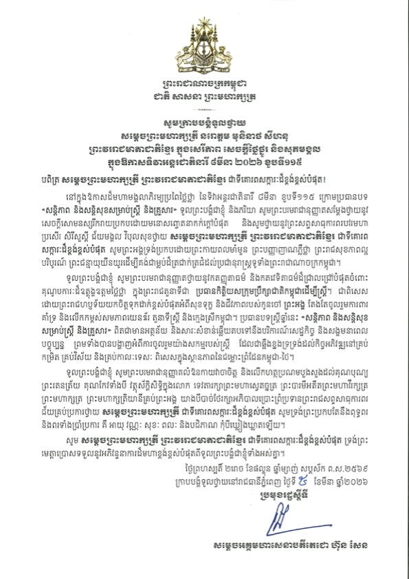 សម្តេចតេជោ ហ៊ុន សែន ប្រមុខរដ្ឋស្តីទី បានផ្ញើព្រះរាជសារថ្វាយព្រះពរ សម្តេចព្រះមហាក្សត្រី នរោត្ដម មុនិនាថ សីហនុ ព្រះវររាជមាតាជាតិខ្មែរ ក្នុងសេរីភាព សេចក្ដីថ្លៃថ្នូរ និងសុភមង្គល នៅក្នុងឱកាស ខួបលើកទី១១៥ ទិវាអន្តរជាតិនារី ៨មីនា ឆ្នាំ២០២៦ ដែលធ្វើឡើង ក្រោមប្រធានបទ «សន្តិភាព និងសន្តិសុខសម្រាប់ស្ត្រី និងគ្រួសារ»។